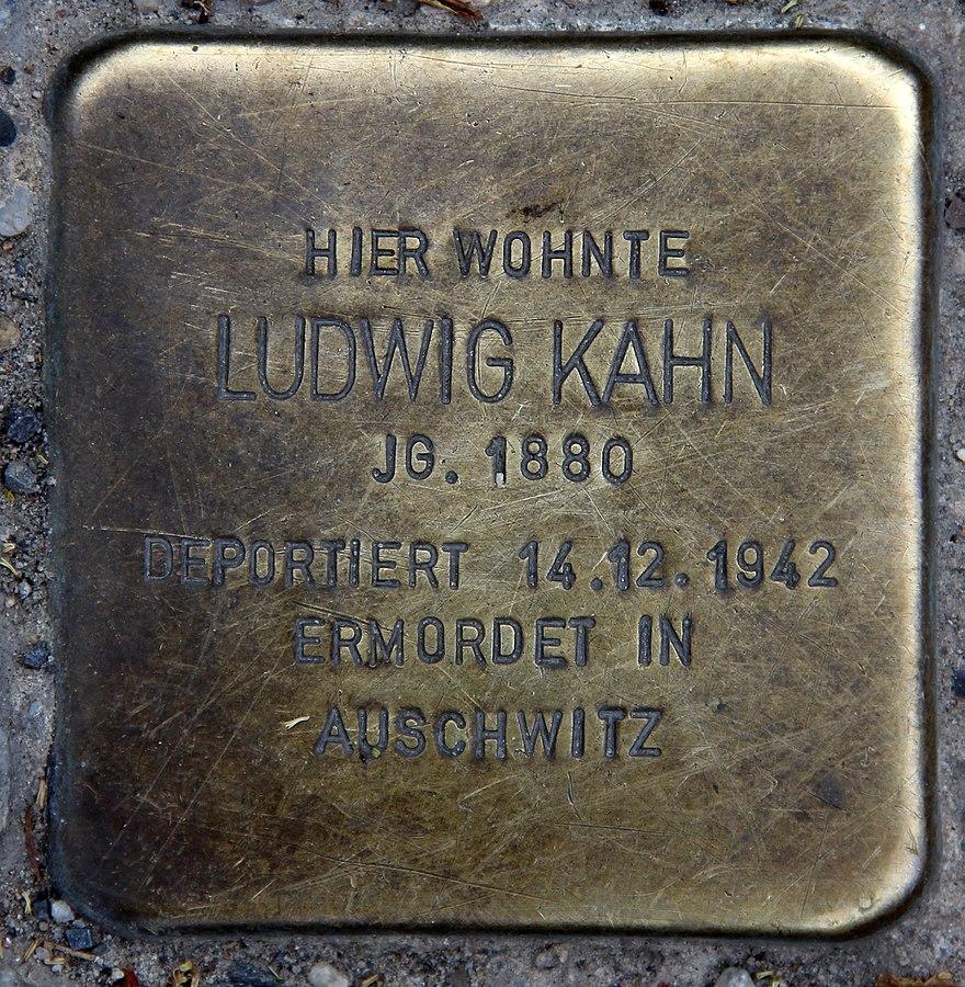 Ludwig Kahn wurde am 8. Februar 1880 in Diez in Hessen-Nassau (heute zu Rheinland-Pfalz gehörig) geboren. Er war Gärtner und verheiratet mit Meta, geborene Michaelis. Am 4. November 1919 wurde ihr Sohn Heinz in Groß Krössin in Pommern geboren. 1939 wohnten die Eheleute noch in der Planettastr. 25 in Zepernick am Rande von Berlin, während ihr Sohn bereits ausgezogen war. 1940 zogen sie nach Berlin und wohnten zuletzt in der Alten Schönhauser Str. 58, wahrscheinlich in der Wohnung von Rosa Michaelis, der Schwiegermutter von Ludwig. Sie betreuten Rosa, nachdem Simon, der Vater von Meta gestorben war. Er ist auf dem Friedhof Weißensee beigesetzt worden. Am 14. Dezember 1942 wurde Ludwig zusammen mit seiner Meta mit dem „25. Osttransport“ nach