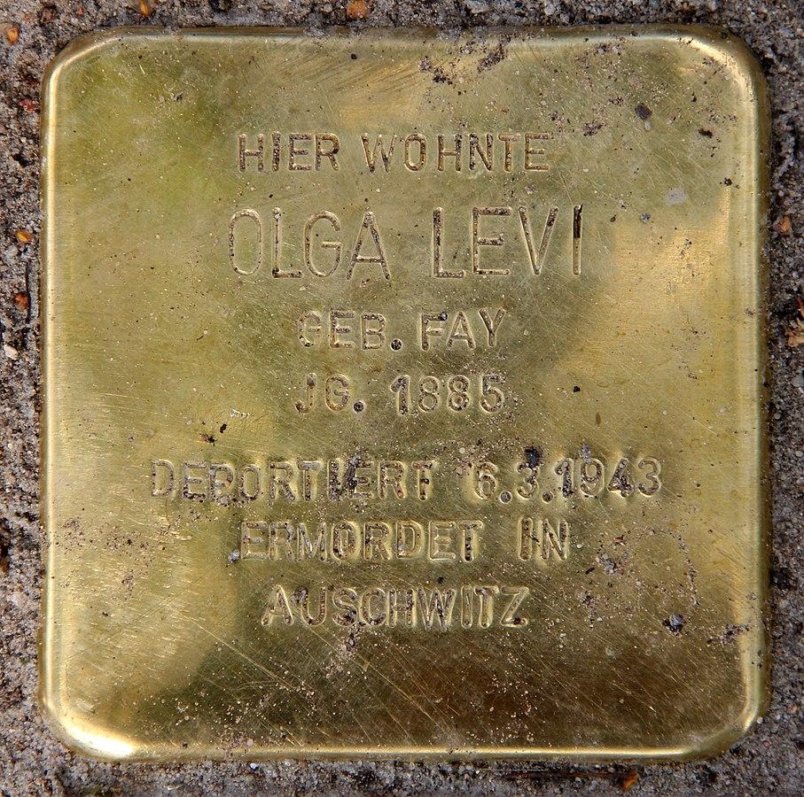 Sie wurde am 06. März 1943 mit dem 35. Osttransport zusammen mit weiteren 656 Juden von Berlin-Moabit aus nach Auschwitz deportiert. Dort wurde Olga Levi ermordet.