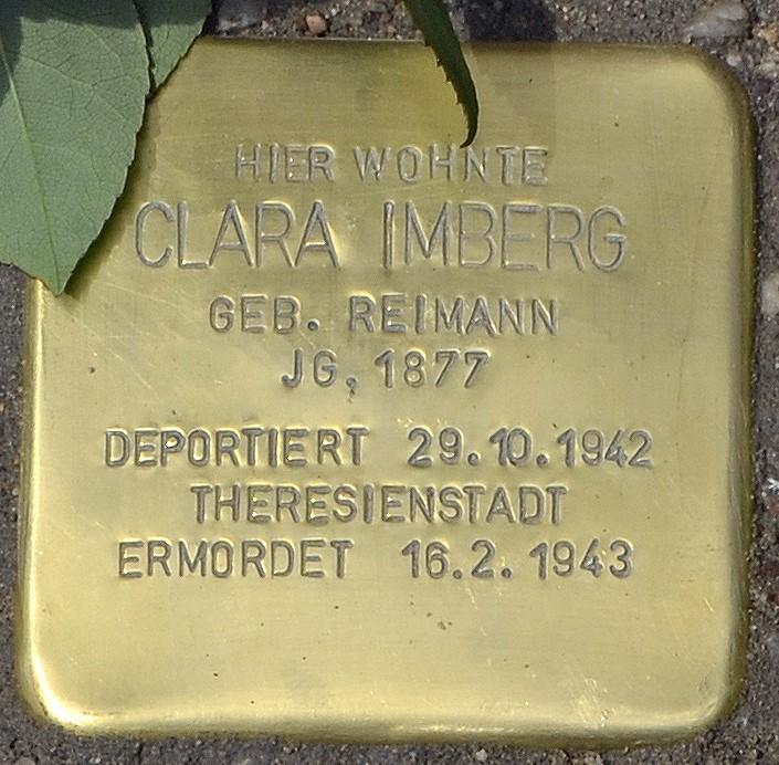 Am 29. Oktober 1942 wurde Clara Imberg mit dem „69. Alterstransport“ und insgesamt 100 Menschen nach Theresienstadt deportiert. Clara traf in Theresienstadt ihren älteren verwitweten Bruder Hugo Reimann, Landgerichtsrat a.D., der bereits seit Juli 1942 in Theresienstadt war. Am 3. Februar 1943 starb er im Ghetto Theresienstadt .