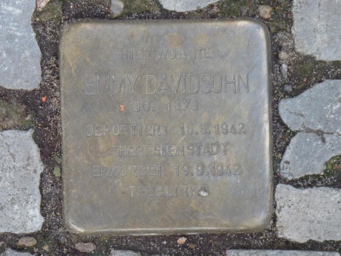 Zu diesem Zeitpunkt lebte Emmy Davidsohn bereits seit über zwei Jahren nicht mehr. Sie war am 16. Juli 1942 mit 99 weiteren Opfern vom Anhalter Bahnhof aus nach Theresienstadt deportiert worden. Auch ihre Nachbarin Helene Brasch war in diesem Zug, vielleicht konnten sich beide gegenseitig etwas Trost spenden. In Theresienstadt war Emmy verheerender Raumnot, Hunger und katastrophalen Hygienebedingungen ausgesetzt. Es kam noch schlimmer: Am 19. September 1942 wurde sie, eingepfercht in einem Zug mit 2000 Menschen, in das Vernichtungslager Treblinka verschleppt. Nur eine Person überlebte, alle anderen, auch Emmy Davidsohn, wurden ermordet, das genaue Datum ihres Todes wissen wir nicht.