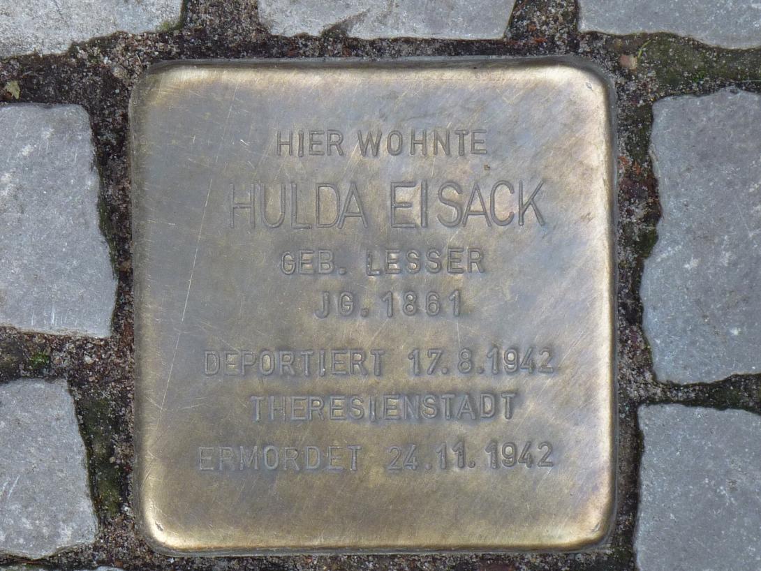 Huldas Schwester Rosa verheiratete Joseph war schon 1917 gestorben, Regina verheiratete Simon starb vermutlich auch früh, da ihr Mann 1899 erneut heiratete. Huldas Schwägerin Sophie Leipziger geb. Eisack lebte mit ihrem Mann in Kiel, siedelte aber 1937 nach Berlin um. 1942 wurde sie, inzwischen verwitwet, am 14. Juli ebenfalls nach Theresienstadt deportiert und erlag dort am 17. September 1943 den menschenverachtenden Lebensbedingungen. Für sie liegt eine Stolperstein in Kiel vor der Bülowstraße 3. Die Gedenkbücher Berlins und des Deutschen Bundesarchivs listen weitere Opfer mit den Namen Lesser und Eisack auf, die in Crone an der Brahe oder in Nakel geboren wurden, ohne dass eine echte genealogische Verbindung zu Hulda Eisack hergestellt werden konnte.