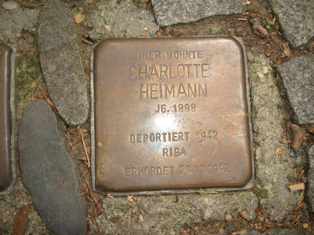Mit dem „22. Osttransport“ nach Riga wurde Charlotte Heimann am 26. Oktober 1942 zusammen mit ihrem Bruder deportiert. Dort wurden beide am 29. Oktober 1942 ermordet.