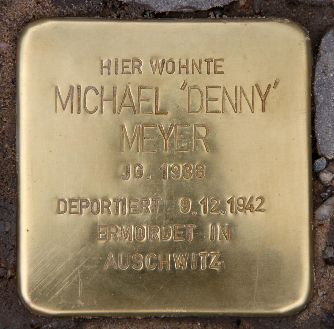 Michael Meyer kam am 30. August 1938 in Köln auf die Welt. Er musste bereits einen der den Juden vorgeschriebenen Vornahmen tragen und so wurde er "Denny" genannt. Alle Formulare, auch die Transportliste nach Auschwitz , sind dementsprechend ausgefüllt. Allein auf dem Gedenkstein, den sein Onkel Ernst Meyer auf dem Zentralfriedhof Friedrichsfelde für die Familien