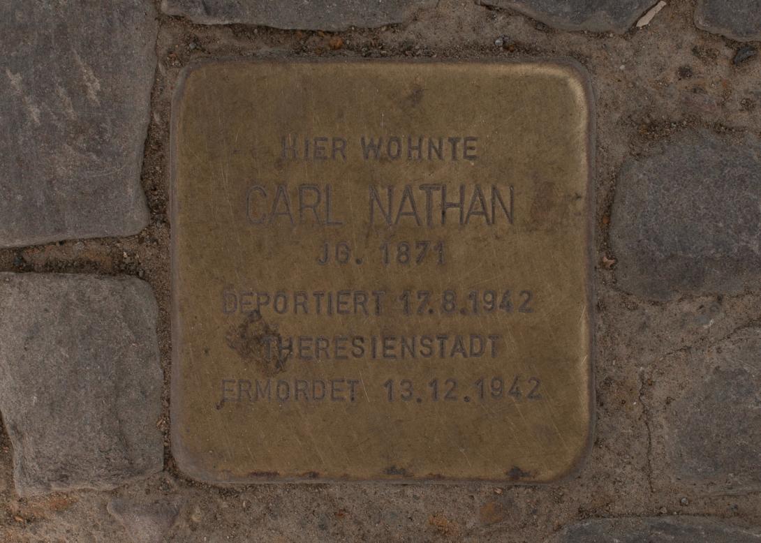 Carl Nathan wurde am 17. August 1942 vom Bahnhof Grunewald in einem Zug mit 1003 Menschen nach Theresienstadt deportiert und am 13. Dezember 1942 umgebracht.