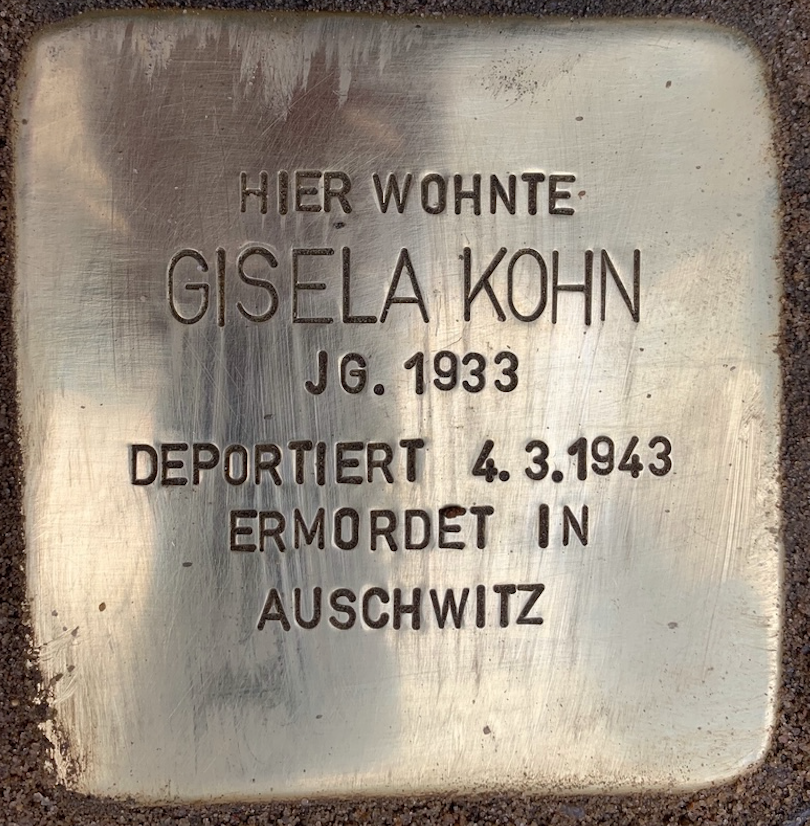 Gisela Kohn kam am 26. Mai 1933 in Berlin zur Welt. Ihre Mutter, die ledige Ilse Elisabeth Kohn, war jüdischer Abstammung. Sie wohnte in der Wiener Straße 28 und arbeitete als Verkäuferin. Giselas Vater soll ein „Arier“ gewesen sein, der offenbar nur unregelmäßig Unterhalt zahlte. Ilse zog mit ihrer Tochter Gisela zurück zu ihren Eltern Isidor und Elise Kohn in die Fürstenstraße 15 (das Haus existiert nicht mehr, dort befindet sich heute die Bergfriedstraße 6).