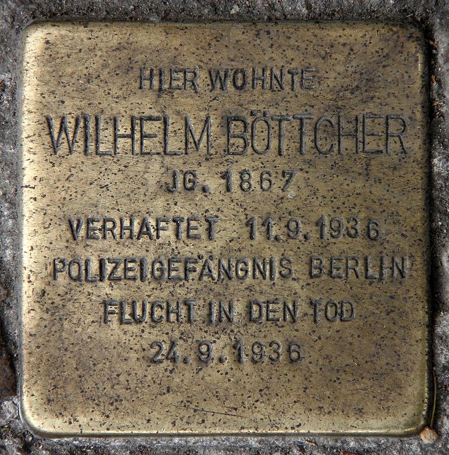 Am 11. September 1936 wurde der 68-jährige Wilhelm Böttcher von der Gestapo verhaftet. Ihm wurde vorgeworfen, seine Wohnung für „Unzucht“ zur Verfügung gestellt und sich als Kuppler betätigt zu haben. Während der Verhöre bewies Böttcher große Standhaftigkeit und weigerte sich, seine Freunde zu belasten. Am 24. September 1936 nahm sich Wilhelm Böttcher im Polizeigefängnis am Alexanderplatz das Leben.