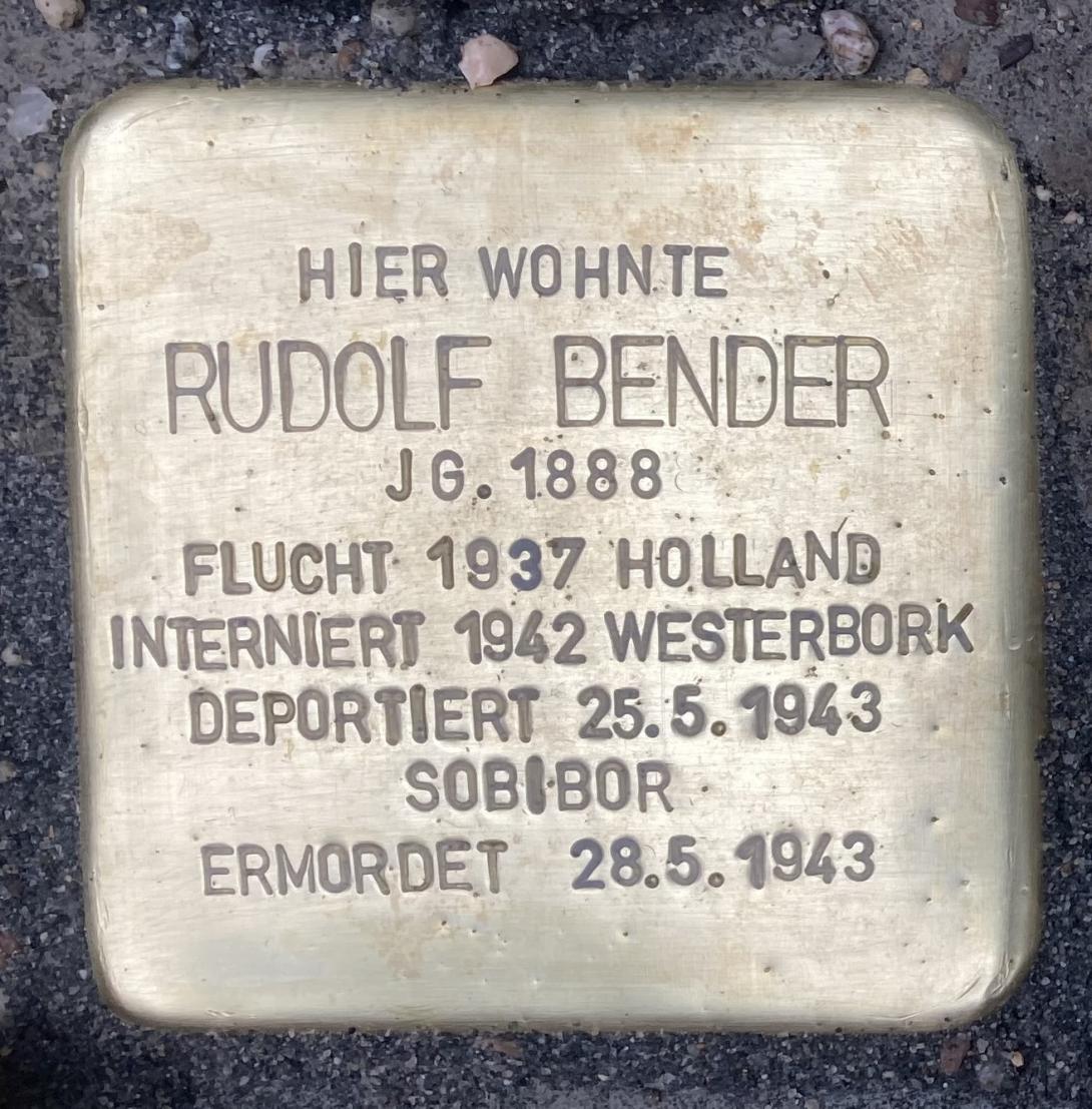 Rudolf Bender wurde am 25. Mai 1943 im Alter von 55 Jahren in das KZ Sobibor deportiert und dort am 28. Mai 1943 ermordet. Seine Frau Gertrud erlitt dasselbe Schicksal. Ihre Tochter Lore erlitt eine Odyssee durch neun Lager, bevor sie kurz vor Kriegsende nahe Hamburg befreit wurde.