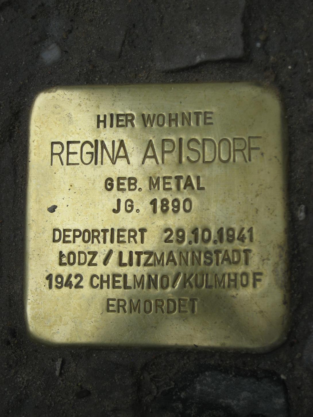 Nachdem sich Regina Apisdorf in der Levetzowstraße 7, einer von der Geheimen Staatspolizei ( Gestapo ) zum Sammellager umfunktionierten Synagoge, registrieren lassen musste, wurde sie am 27. Oktober 1941 am Bahnhof Grunewald mit etwa 1 000 Menschen in einen Sonderzug getrieben, der ins Ghetto Lodz (von den Nazis, die Polen besetzt hatten, in Litzmannstadt umbenannt) fuhr. Von hier wurde sie am 5. Mai 1942 nach Kulmhof (Chelmno) weitertransportiert, wo sie wie 10 000 andere als „nicht arbeitsfähig“ eingestufte Juden kurz danach ermordet worden ist.