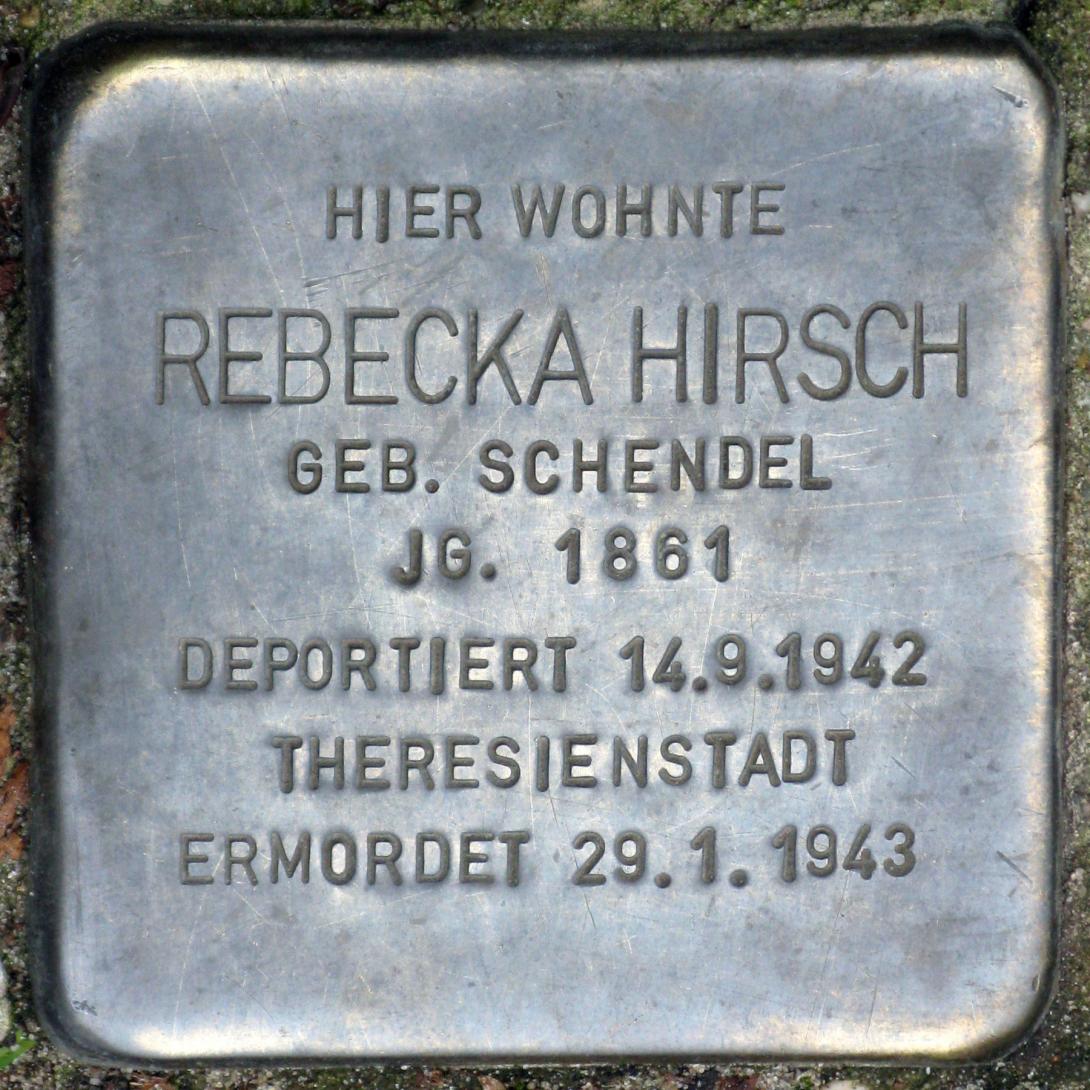 Rebecka (Rebekka) Schendel wurde am 4. November 1861 in Wongrowitz, Kreis Bromberg in Posen, dem heute polnischen Wągrowiec, geboren. Sie heiratete einen Herrn Hirsch (Vorname unbekannt) und zog nach Berlin. Am 22. Oktober 1885 wurde ihre Tochter Johanna in Berlin geboren. Vermutlich hatte die Familie noch eine Tochter mit Namen Berta, verheiratete Baija. Rebecka Hirsch wohnte bis zu ihrer