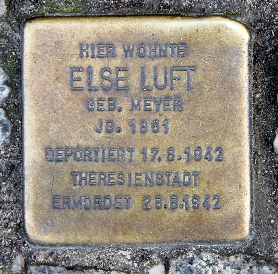 Am 17. August 1942 wurde die damals 81-jährige Else Luft mit dem „1. großen Alterstransport“ in das Ghetto Theresienstadt deportiert. Insgesamt 1002 Menschen hatte die Gestapo für diesen Transport aus verschiedenen jüdischen Altenheimen in Berlin abgeholt . Aus dem Minna-Schwarz-Heim in der Brunnenstraße 41 waren es insgesamt 53 Personen. Als sie die Nachricht von der kurz bevorstehenden Deportation erhielt, verfasste Else Luft noch einen Abschiedsbrief für ihre Familie: „[W]enn später was geschickt werden kann, so denkt an meinen wahrscheinlichen Hunger. Behaltet mich in gutem Andenken, damit sich der letzte Eindruck von meiner kolossalen Aufgeregtheit wieder verwischt. Gern hätte ich Euch noch gesehen, aber es ist wohl besser so: denn ich klappe bald zusammen. [...] Wie noch alles werden wird weiß ich nicht jedenfalls fahre ich ohne einen einzigen Groschen in die unbekannte Welt gänzlich arm und mittellos bloß mit den paar Lumpen. Gott gebe mir noch die Kraft dazu!“ Nur wenige Tage nach ihrer Ankunft in Theresienstadt starb Else Luft am 28. August 1942.