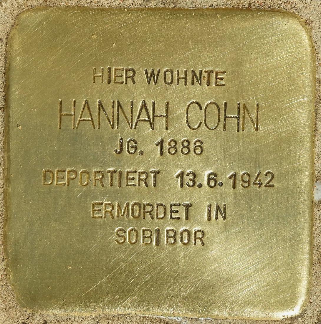 Hannah Cohn wurde am 11. August 1886 in der Stadt Lyck im damaligen Ostpreußen (heute Woiwodschaft Bialistok, Polen) geboren. Wann und warum sie nach Berlin kam, konnte nicht herausgefunden werden. Sie war ledig und hatte vermutlich keine Kinder. Sie wohnte laut Volkszählung vom 17. Mai 1939 am Kaiserplatz 11 (heute Bundesplatz), ist dort aber in den historischen Adressbüchern nicht zu finden. Das mag bedeuten, dass sie nicht „Haushaltungsvorstand“ war – nur der wird in den Adressbüchern genannt – sondern zur Untermiete wohnte oder bei einer Familie angestellt war. Genaues darüber und ob sie berufstätig war, war nicht zu ermitteln.