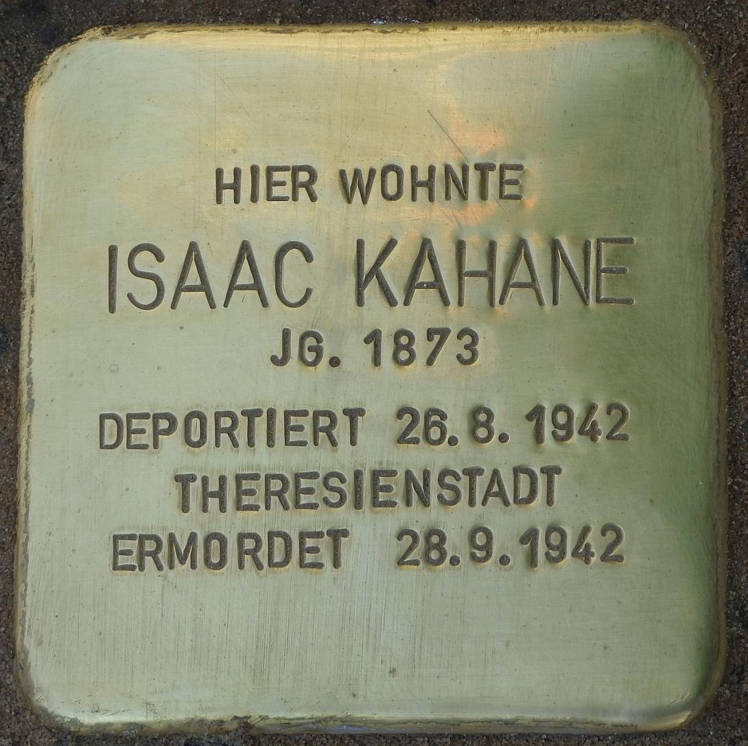 In den historischen Berliner Adressbüchern ist im Haus Kaiserplatz 18 seit mindestens 1935 ein Kaufmann Max Kahane verzeichnet. Das mag ein Verwandter gewesen sein. Laut Volkszählung vom 17. Mai 1939 lebte jedenfalls Isaac Kahane hier. Er teilte seine Wohnung mit den beiden Untermieterinnen Cäcilie Butterweich und Selma Leubuscher.