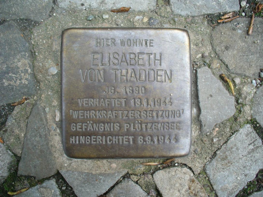 Elisabeth von Thadden wurde am 29. Juli 1890 in Mohrungen/Ostpreußen (heute Morąg) geboren. Sie hatte 1927 das Evangelische Landerziehungsheim für Mädchen Schloss Wieblingen gegründet, wo sie seit 1941 wegen ihrer aufrechten anti-nationalsozialistischen Haltung nicht mehr tätig sein durfte. Sie war Mitglied der Bekennenden Kirche. Seit 1942 war Elisabeth von Thadden für das Deutsche Rote Kreuz tätig, zuletzt als Leiterin von Soldatenheimen in Frankreich. Elisabeth von Thadden kritisierte in Gesprächen die nationalsozialistischen Gewaltverbrechen und unterstützte verfolgte Juden. Von dem