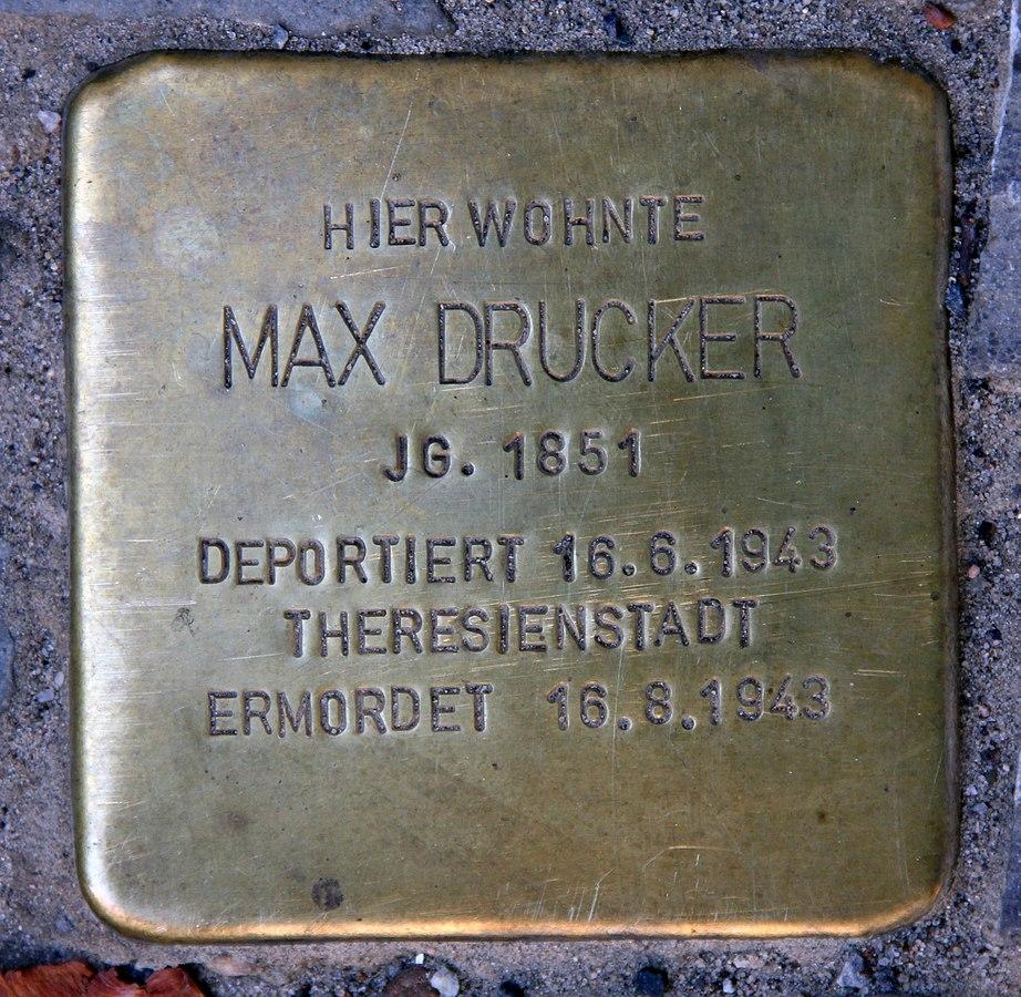 Max Drucker ist am 12. März 1851 in Neuruppin (Brandenburg) geboren. Er war Ziegeleibesitzer und wohnte viele Jahre, mindestens seit 1910, später als „Privatier“, der also von seinem Vermögen leben konnte, im Erdgeschoss der Carmerstraße 2. Als er am 16. Juni 1943 zusammen mit seiner Frau Ida nach Theresienstadt deportiert wurde, war er 92 Jahre alt und damit wohl einer der Ältesten, die aus Berlin verschleppt worden sind. Fast alle der 429, die in diesem Zug mitfahren mussten, waren Patienten oder Patientinnen des Jüdischen Krankenhauses an der Iranischen Straße 2. Max Drucker war einer von ihnen, ebenso seine Frau Ida. Er war in Theresienstadt als „Witwer“ und als „Rentner“ registriert. Deutschen jüdischen Senior/innen war meistens versprochen worden, das Theresienstädter Ghetto sei ein Kurort.