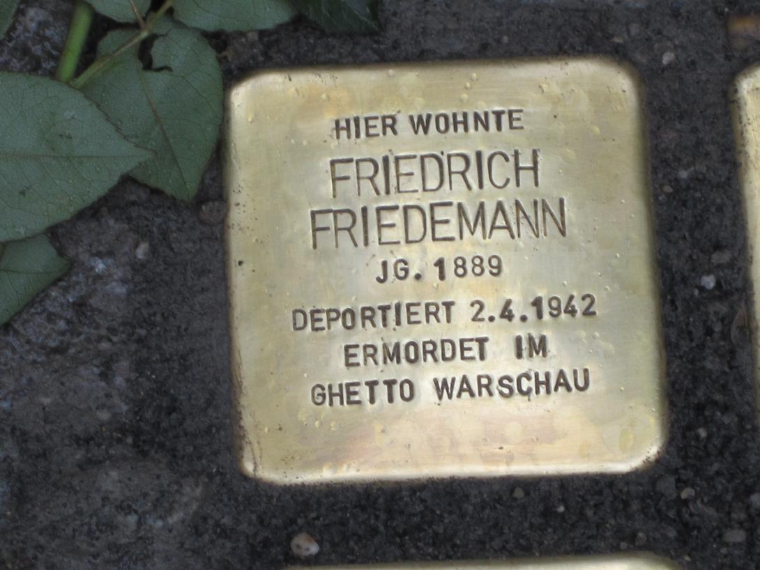 Friedrich Friedemann wurde am 23. Dezember 1889 als Sohn von Louis Friedemann und Bertha Friedemann, geborene Frank, in Köslin/Pommern geboren. Der Vater war Kaufmann und besaß einen Laden in Köslin, Am Markt 15. Friedrich Friedemann besuchte das Königliche Gymnasium in Köslin und begann nach dem Abitur ein Jurastudium in Halle, Berlin und Greifswald. Dann begann der Erste Weltkrieg und er wurde eingezogen. Er kämpfte in einem Jägerbataillon bis Ende des Krieges. Dabei wurde er zwei Mal verwundet, einmal davon schwer. Nach dem Ende des Krieges versuchte er mit Hilfe seines Halbbruders, des Justizrates Dr. Gustav Friedemann, sein Jurastudium wieder aufzunehmen und mit dem Referendarexamen zum Abschluss zu bringen, scheiterte aber. Sein elterliches Erbteil war außerdem aufgebraucht und er hatte den Ehrgeiz, so bald wie möglich sein eigenes Geld zu verdienen. So trat er in eine Buchhandlung in der Kantstraße ein und arbeitete sich dort aufgrund seiner besonderen Fähigkeiten langsam hoch. In der Buchhandlung lernte er auch seine zukünftige Frau Else Marcuse kennen und heiratete sie Anfang der 1920er Jahre. Er wurde Vater der Tochter Ruth Gisela, geboren am 12. September 1921, und der am 26. Oktober 1922 zur Welt gekommenen Tochter Ursula Brigitte. Friedrich Friedemann und seine Kinder waren evangelisch getauft. Wann sie aber zum Christentum übertraten, ist nicht bekannt. Möglicherweise waren er und seine beiden Töchter bereits vor seiner Frau konvertiert, denn Else Friedemann wurde erst 1939 in der Messiaskapelle in der Kastanienallee 22 /Prenzlauer Berg in die Gemeinschaft evangelischer Christen aufgenommen. Die Friedemanns lebten privat in der Brünhildestraße 1 in der vierten Etage. Mitte der 1920er Jahre eröffneten sie mithilfe der Mitgift von Else Friedemann eine eigene Buchhandlung. Aufgrund der Auswirkungen durch die Inflation und der damit einhergehenden Geldentwertung brach das Geschäft aber zusammen. Friedrich Friedemann konnte jedoch noch einige kostbare Bücher retten. Diese bildeten den Grundstock für ein eigenes Antiquariat. Wegen der Geldentwertung hatten sich zudem viele Menschen von ihren wertvollen Büchern trennen müssen. Mit diesen Geschäften ernährte er seine Familie sehr gut, zumal er über ausgezeichnete Kundenkontakte und beste Fachkenntnisse verfügte. Seine Schwägerin, die die Tochter Ursula Brigitte nach dem Krieg in ihrer Entschädigungsantragsangelegenheit unterstützte, schätzte später, dass er monatlich etwa 500,-- bis 600,-- RM verdiente. Im Oktober 1932 allerdings war die Familie gezwungen, die Wohnung in der Brünhildestraße 1 aufzugeben und in eine Zweieinhalbzimmer-Wohnung am Cosimaplatz 5 (bis 1935: Wagnerplatz), Parterre, umzuziehen. Sie zahlte dafür 40,-- RM. Im Jahre 1935 wurde Friederich Friedemann darüber hinaus aus der Reichsschrifttumskammer ausgeschlossen. Dadurch verminderten sich die Einnahmen erheblich. Er sah sich deshalb gezwungen, als Bauarbeiter zu arbeiten und damit den Unterhalt seiner Familie zu sichern. Bald aber schon wurde er zur Zwangsarbeit verpflichtet. Er arbeitete in den Pertrix-Werken in Niederschöneweide und verdiente dort wöchentlich 24,-- RM. Die jüngere Tochter Ursula wanderte am 27. Juni 1939 nach England aus, die Tochter Ruth hingegen blieb in Berlin. Else Friedemann, die ebenfalls zur Zwangsarbeit herangezogen worden war, beantragte aus Gründen, die wir nicht kennen, zu Beginn der 1940er Jahre die Scheidung von ihrem Mann. Im März 1942 wurde die Scheidung rechtskräftig, das Paar lebte aber nach wie vor zusammen. Am 31. März 1942 unterschrieb Friederich Friedemann eine Erklärung, dass man ihn über die Beschlagnahmung seines gesamten Vermögens unterrichtet und er "bei einem Verstoß gegen diese Anordnung auf keine Nachsicht zu rechnen habe." Am 1. April 1942 füllte er seine Vermögenserklärung aus. Sein Gesamtvermögen gab er darin mit 5,-- RM an. Darüber hinaus schuldete er dem Bezirksamt Schöneberg noch eine Geldbuße in Höhe von 110,-- RM und der Gerichtskasse 100,-- RM an Gerichtskosten für die Ehescheidung. Er führte auch an, dass er zur Zahlung eines Unterhalts an seine geschiedene Frau verpflichtet war.