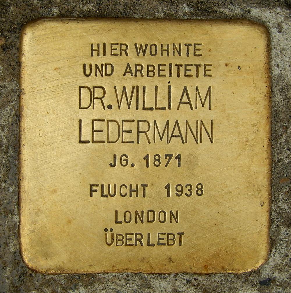 Dr. William Ledermann wohnte und praktizierte in der Cuvrystraße 17, bis ihm 1938 aufgrund seiner jüdischen Abstammung die Approbation als Arzt entzogen wurde. Das Ehepaar Ledermann emigrierte im Dezember 1938 nach London, lebte sich dort aber nicht ein.