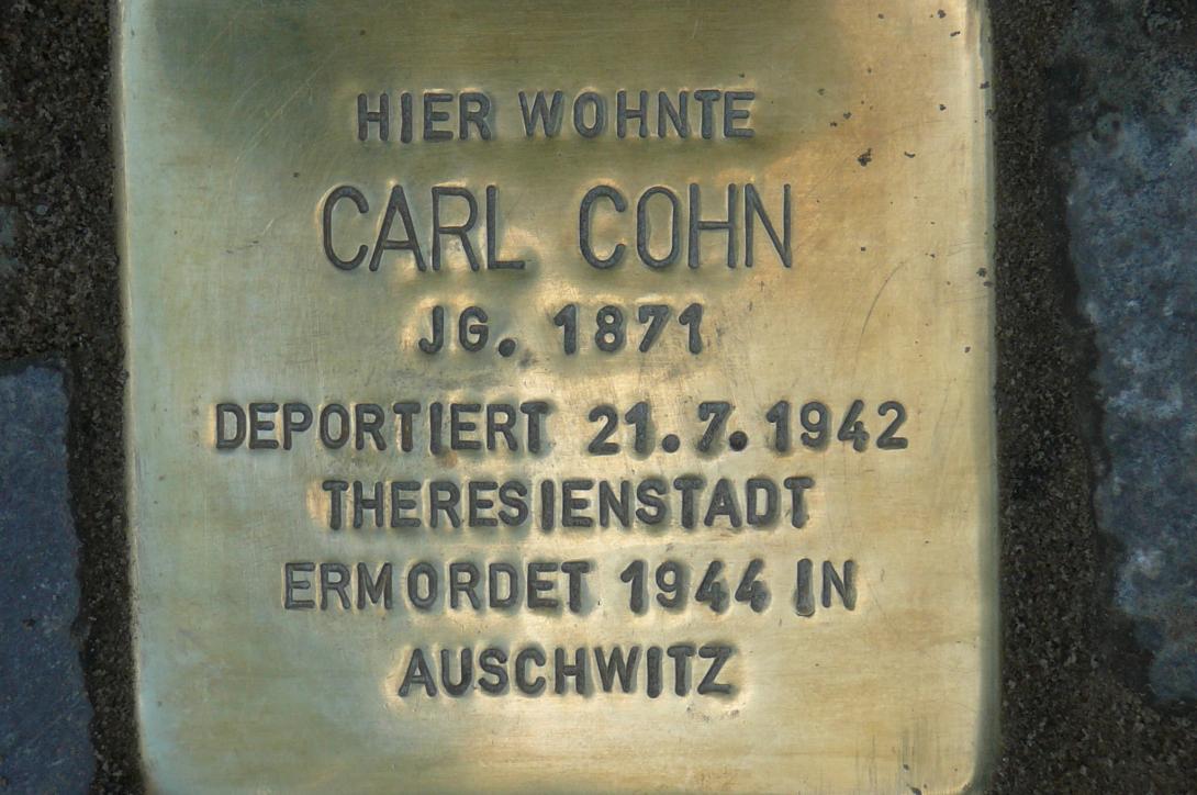 Ein knappes Jahr später, am 21. Juli 1942, wurden beide mit 71 und 69 Jahren zusammen mit 98 weiteren Personen nach Theresienstadt deportiert. Außer ihnen überlebten von diesem Transport nur zwei das Ghetto Theresienstadt . Fast zwei Jahre gelang es ihnen, unter den schrecklichen Bedingungen im Lager mit ständiger Todesfurcht am Leben zu bleiben. Dann wurden sie am 16. Mai 1944 weiter deportiert nach Auschwitz , zusammen mit 2 493 Menschen. Davon überlebten 34. Carl und Gertrud Cohn gehörten nicht zu ihnen. Carl starb 1944. Gertruds Todesdatum ist nicht bekannt.