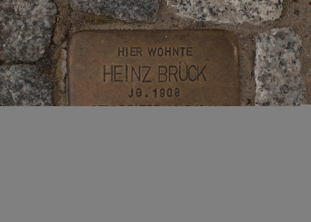 Am 29. Juni 1937 heirateten Heinz Brück und Johanna Müller im Standesamt Berlin-Mitte. Johanna Müller galt als „Mischling ersten Grades“ und wurde nach der Eheschließung als Jüdin behandelt. Die Eheleute wohnten von 1937 bis Anfang 1943 in der Dahlmannstraße 1. Sie teilten sich im 2. Aufgang in der 2. Etage eine Wohnung, in der sie ein Zimmer gemietet hatten, mit der Familie Carl sowie Gertrud und Martin Cohn. Am 4. Februar 1943 konnten Heinz und Johanna Brück der Verhaftung entgehen. Da die Wohnung in der Dahlmannstraße 1 versiegelt wurde, begann mit diesem Tag ihr Leben in der Illegalität. Bei seiner nichtjüdischen Schwiegermutter, Frieda Müller, in der Fischerstraße und bei Frau Schauer in der Sybelstraße konnten Heinz und Johanna Brück vorübergehend untertauchen. In der Wohnung von Gertrud Borchardt, einer Freundin von Johanna Brück, hatten sie dann für längere Zeit ein Versteck. Doch am 11. Juli 1944 wurde das Ehepaar nach einer Denunziation in der Wohnung der Freundin entdeckt, verhaftet und in das Sammellager Schulstraße eingeliefert. Heinz Brück wurde am 12. Juli 1944 in das Konzentrationslager Auschwitz deportiert. Am 26. Oktober 1944 wurde er in das KZ Stutthof bei Danzig überstellt und am 26. November 1944 ins KZ Buchenwald bei Weimar verlegt. Heinz Brücks Todesdatum ist der 22. Dezember 1944. Johanna Brück wurde im September 1944 in das Ghetto Theresienstadt gebracht. Im Mai 1945 wurde sie in Theresienstadt befreit und kehrte im Juli nach Berlin zurück. 1947 emigrierte sie in die USA und starb im Juli 2005 in New York. Heinz Brücks Mutter Rebekka war 1940 im Jüdischen Krankenhaus gestorben. Der Vater Georg, geboren am 21. April 1871 im schlesischen Myslowitz (heute: Mysłowice/Polen), wurde am 10. August 1942 ins Ghetto Theresienstadt deportiert und dort am 24. November 1942 umgebracht. Sein Bruder Gerhard, geboren am 2. Januar 1901 in Berlin, wurde am 15. August 1942 nach Riga verschleppt und dort am 18. August ermordet. Erich Brück, der andere Bruder, konnte nach Südafrika flüchten.