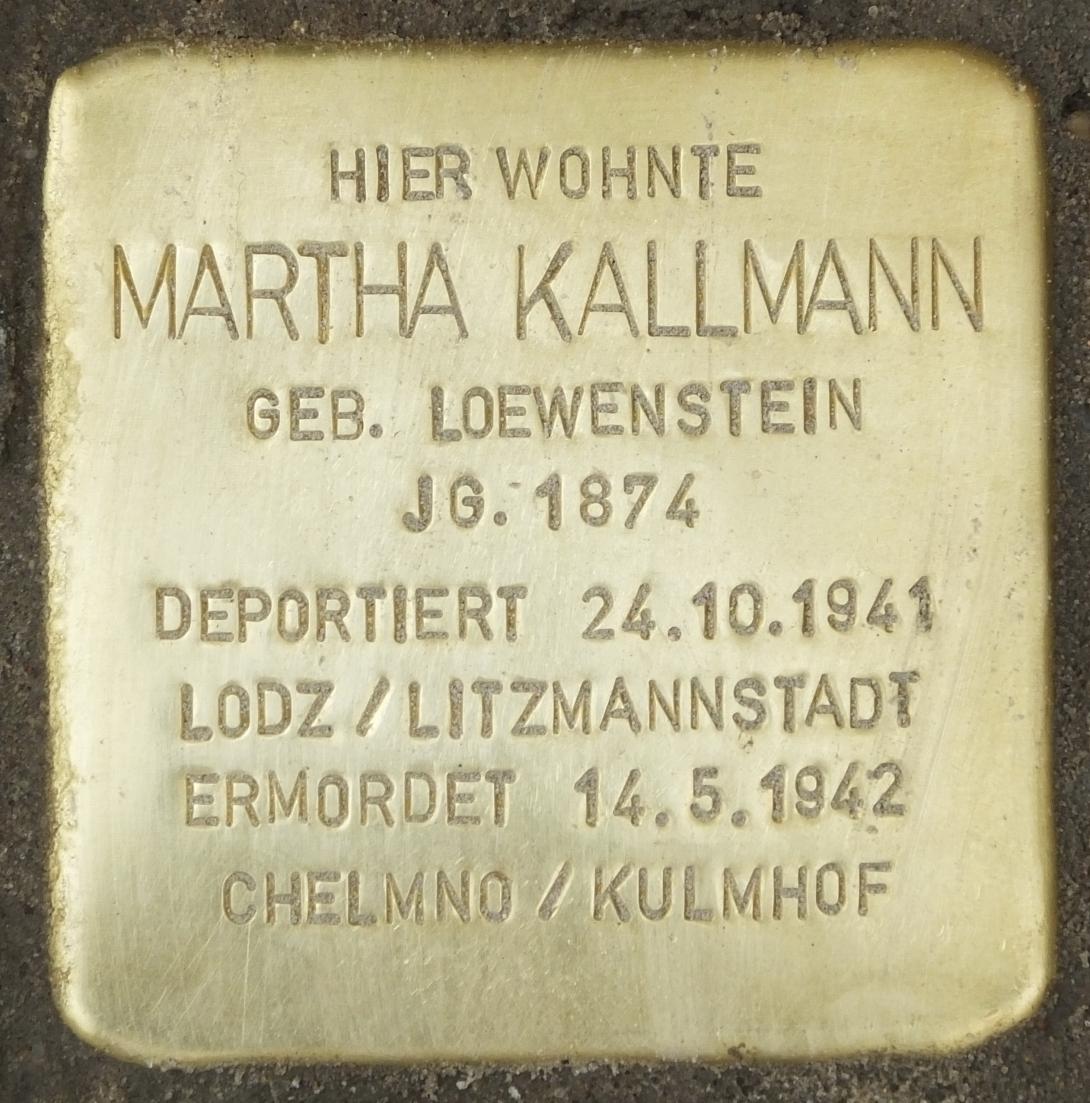 Martha Kallmann, geb. Loewenstein, ist am 2. Januar 1874 in Berlin geboren. Sie war Inhaberin des Süßwarengeschäftes „Kallmanns Süße Ecke“ in der Dahlmannstraße 1, im Branchenbuch eingetragen unter der Rubrik „Konfitüren und Zuckerwaren“. In diesem Haus wohnte sie auch mit ihrem Mann Martin und ihren Söhnen Max und Adolf. Ihr Mann, geboren am 10. Juli 1869, starb am 7. Mai 1935 an einer Lungenentzündung. Ihr Sohn Max flüchtete nach Frankreich, von wo aus er über Drancy nach