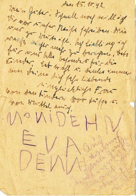 „Schnell noch will ich Dir vor unserer Reise schreiben wie es uns zumute ist. Ach Liebling ich weiß nicht mehr zu berichten. Bete für uns alle, besonders für die Kinder. Hab Kraft und denke immer an Deine dich sehr liebende und unglückliche Frau. Von den Kindern 1000 Küsse und von Muttel auch.“