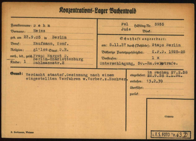 Heinz Dehns Versuch, Ende 1936 eine „Web- und Wirkwarenfabrikation“ aufzubauen, hatte keinen Bestand: Am 5. November 1937 wurde er von der Gestapo wegen des angeblichen Besitzes verbotener oppositioneller Publikationen und „Verdachts staatsf.[eindlicher] Gesinnung nach einem eingestellten Verfahren w. Vorber.[eitung] zum Hochver.[rat]" verhaftet.