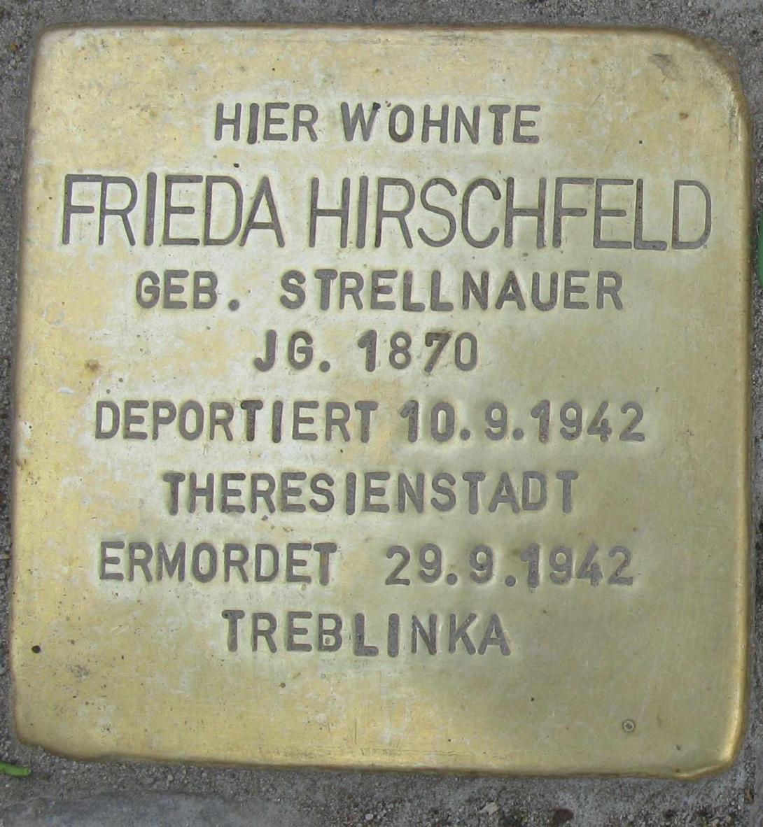 Frieda Hirschfeld geb. Strellnauer ist am 15. September 1870 in Thorn (Torun), damals Westpreußen, geboren. Sie hatte eine Tochter Meta, die am 16. Dezember 1894 in einer Kleinstadt nahe Danzig zur Welt kam. Im Adressbuch 1939 war sie in der Deidesheimer Straße 12 mit dem Zusatz „Witwe“ eingetragen. Von dort wurde Frieda Hirschfeld eine Tages im Morgengauen abgeholt und in einem Lastwagen der Polizei in die Sammelstelle Große Hamburger Straße 26 verschleppt. Zunächst wurde sie am 10. September 1942 aus Berlin nach Theresienstadt gebracht. Todesort war allerdings Treblinka, am 20. September 1942 (fehlerhafte Inschrift: 29.9.1942), wohin sie aus Theresienstadt weiterdeportiert worden ist.