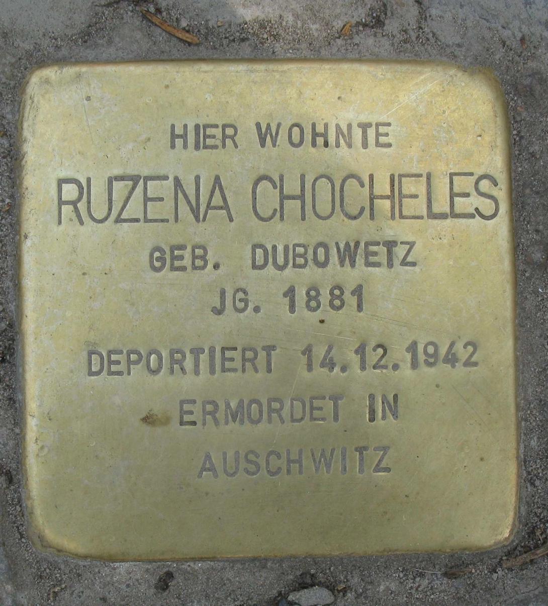 Ruzena Chocheles geb. Dubowetz ist am 25. August 1881 in Horka (damals Ungarn, später Tschechoslowakei, jetzt Slowakei) geboren. Im Melderegister von 1939 war sie mit der „Staatsbürgerschaft CSR“ notiert.