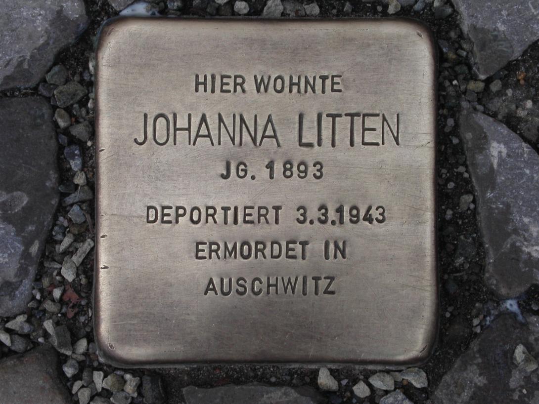 Johanna Litten ist am 10. November 1893 in Köslin in Pommern geboren. Sie war unverheiratet. Sie sei „vorübergehend abwesend“ gewesen, wurde bei der Polizei eingetragen – meistens stand dieser Begriff für „untergetaucht“. Jedoch ist wahrscheinlich, dass Johanna Litten Zwangsarbeiterin war. Von der Gustloffstraße 39, wie die heutige Dernburgstraße damals hieß, wo sie wohnte, im Adressbuch war sie als Hanna mit dem Zusatz „Frl“ (Fräulein) ohne Beruf verzeichnet, ist sie noch in die Johann-Georg-Straße 12 umgesiedelt worden. Dort musste sie in eine kleinere Behausung ziehen. Am 3. März 1943 ist Johanna Litten dann nach Auschwitz deportiert worden. In dem Vernichtungslager wurde sie gleich nach der Ankunft in Birkenau in einer der Gaskammern ermordet.