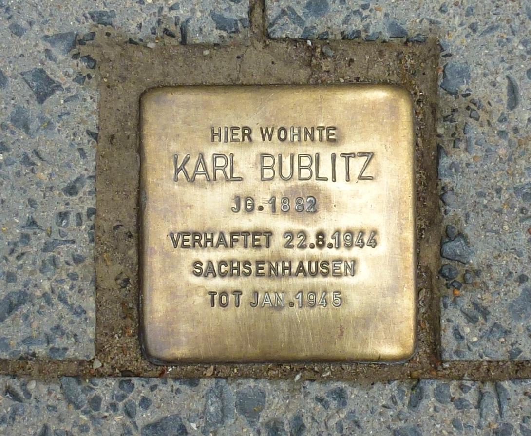 Der kaufmännische Angestellte Karl Bublitz heiratete 1907 die Jüdin Klara Jacob, die eine Schwester von Mathilde Jacob, Rosa Luxemburgs Sekretärin, war. Er wurde 1910 Geschäftsführer beim Zentralverband der Angestellten, einer Gewerkschaft. Bereits vor dem Ersten Weltkrieg trat er in die SPD ein, wechselte 1917 zur USPD und kehrte 1922 zur SPD zurück. 1929 fand er eine Anstellung beim Berliner Arbeitsamt Nord. 1933 wurde er als Stadtverordneter wiedergewählt. Nach dem SPD-Verbot vom Juni und der Verordnung zur Sicherheit der Staatsführung vom Juli 1933 wurde ihm das Mandat entzogen und die Tätigkeit als Stadt- und Bezirksverordneter verboten. Bublitz verlor auch seinen Vorstandsposten bei der AOK der Stadt Berlin und seine Stelle als Direktor des Arbeitsamtes. Zunächst machte er sich selbständig und eröffnete ein Holzgeschäft an der Gotzkowskybrücke, das er aber 1937 aufgeben musste. Danach arbeitete er als Versicherungsangestellter. Im Zuge der Aktion „Gewitter“ wurde er am 22.8.1944 verhaftet und in das KZ Sachsenhausen gebracht. Anfang Februar 1945 erhielten seine Frau und sein Sohn Felix, der als „Mischling“ seit 1944 zur Zwangsarbeit verpflichtet war, den letzten Brief von Karl Bublitz aus Sachsenhausen. Dann kam nur noch ein Zettel, unterschrieben von einem SS-Hauptscharführer aus der Poststelle von Sachsenhausen: „Das hier für Karl Bublitz abgegebene Packet ist nicht zustellbar und ist bis 17.2.1945 auf der Poststelle abzuholen, ansonsten der Inhalt dem Schutzhaftlager zur Verteilung übergeben werden muss.“ Nach dem Tod seiner Mutter wanderte Felix Bublitz 1950 nach Australien aus. Er beantragte erfolgreich eine Entschädigung für die Einkommensverluste seiner Familie.