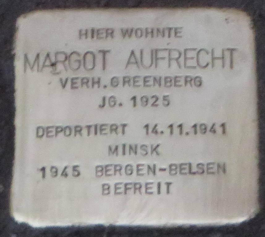 Am 14.11.1941 wurde Margot Aufrecht mit ihren Eltern und ihrem Bruder ins Ghetto von Minsk deportiert. Während Hermann und Erna Aufrecht dort schon am 28. Juli 1943 und Herbert Aufrecht bei der Auflösung des Ghettos am 15. September 1943 erschossen wurden, sollte Margot mit acht anderen jüdischen Häftlingen zur Zwangsarbeit bei Telefunken nach Berlin zurückgebracht werden. Aber die kriegsbedingten Zerstörungen in Berlin waren schon so weit fortgeschritten, dass sie zunächst in ein Gefängnis in Groß Grönau, zuletzt – im Januar 1945 – in die Hölle des Konzentrationslagers Bergen-Belsen gebracht wurde.