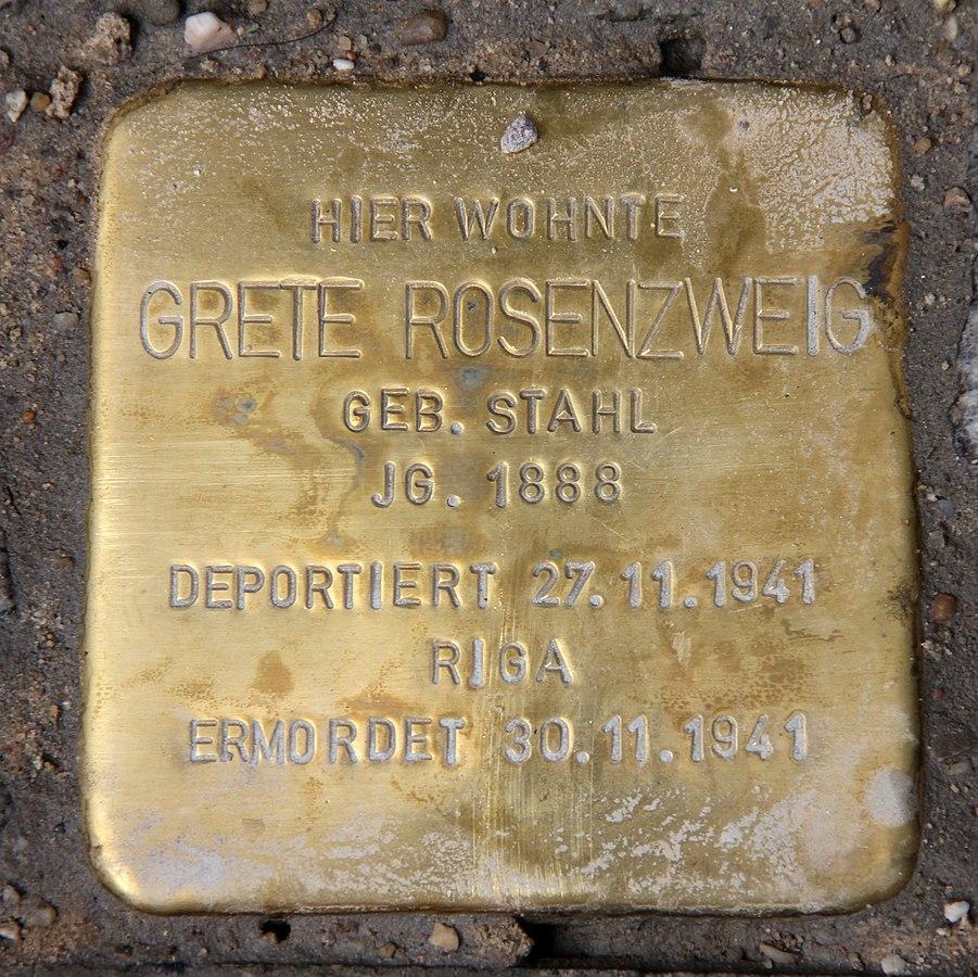 Grete Rosenzweig wurde am 27. November 1941 aus der Wohnung Schönhauser Allee 9a abgeholt und vom Bahnhof Grunewald aus nach Riga deportiert.