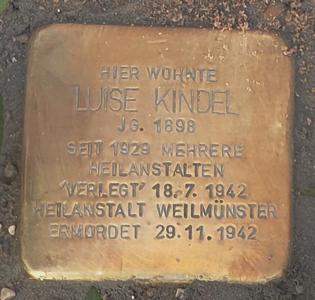 Luise Kindel war gerade 31 Jahre alt, als sie im Oktober 1929 in die Heil- und Pflegeanstalt Buch eingewiesen wurde. Sie hatte bis zu diesem Zeitpunkt keinen Berufsabschluss erlangt, ihr Familienstand war ledig. Ihr Name ist im „Bucher Gedenkbuch“ aufgeführt. Eine Patientenakte existiert nicht mehr. Fast 11 Jahre verblieb Luise Kindel in der Heilanstalt Buch, in den Jahren 1940 bis 1942 wurde sie in die sogenannten Heil- u. Pflegeanstalten Wuhlgarten, Sorau, Teupitz und zuletzt – nach Weilmünster „verlegt“, wo sie am 29.11.1942 zu Tode kam. In den Büchern der Heil- und Pflegeanstalt Weilmünster ist vermerkt: Luise Kindel – Todesursache Marasmus (= Hungersterben / körperlicher Verfall) bei Schizophrenie.