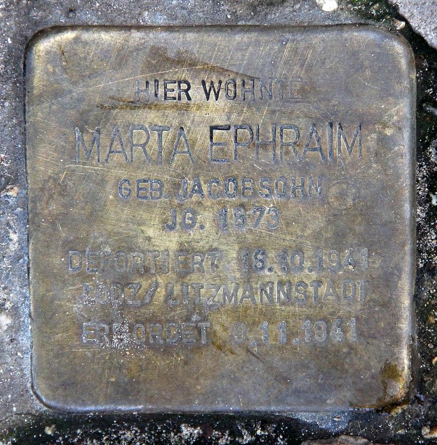 Am 18. Oktober 1941 wurde Marta Ephraim gemeinsam mit ihrer Schwester Pauline, ihrem Sohn Walter und ihrer Cousine Anna Kulp, geborene Jacobsohn, nach Łódź / Litzmannstadt deportiert. Am 28. Oktober 1941 wurden in Berlin ihre Wohnungseinrichtung und ihre letzte Habe versteigert.