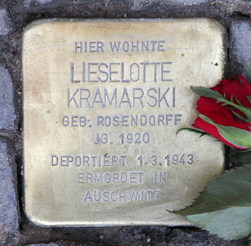Ebenfalls zur Familie Rosendorff gehörte Lieselotte Kramarski, geboren am 22. Januar 1920 in Berlin. Sie ließ sich bei der Volkszählung am 17. Mai 1939 unter ihrem Geburtsnamen Lieselotte Rosendorff in der Gervinusstraße 19a eintragen. Gleichzeitig war sie mit Paul Kramarski, geboren am 2. April in Schaerbeck/Belgien, in der Mommsenstraße 26 gemeldet. Beide sind am 1. März 1943 aus dem Sammellager an der Großen Hamburger Straße 26 mit einem der umfangreichsten Transporte, die am Bahnhof Grunewald abgingen, mit insgesamt 1722 Menschen nach
