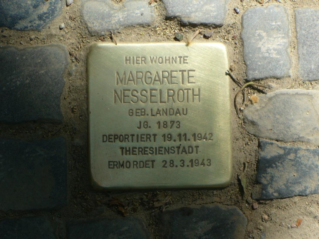 Margarete Nesselroth, geb. Landau, wurde am 4. Mai 1873 in Breslau geboren. Sie war verwitwet und wohnte in der Giesebrechtstraße. Ihre Kinder, denen wohl die Flucht gelungen war, lebten im Ausland. Wo genau, gab sie nicht preis. Das einzige, was über Margarethe Nesselroth bekannt ist, lässt sich der Vermögenserklärung vom 12. November 1942 entnehmen, die sie kurz vor ihrer