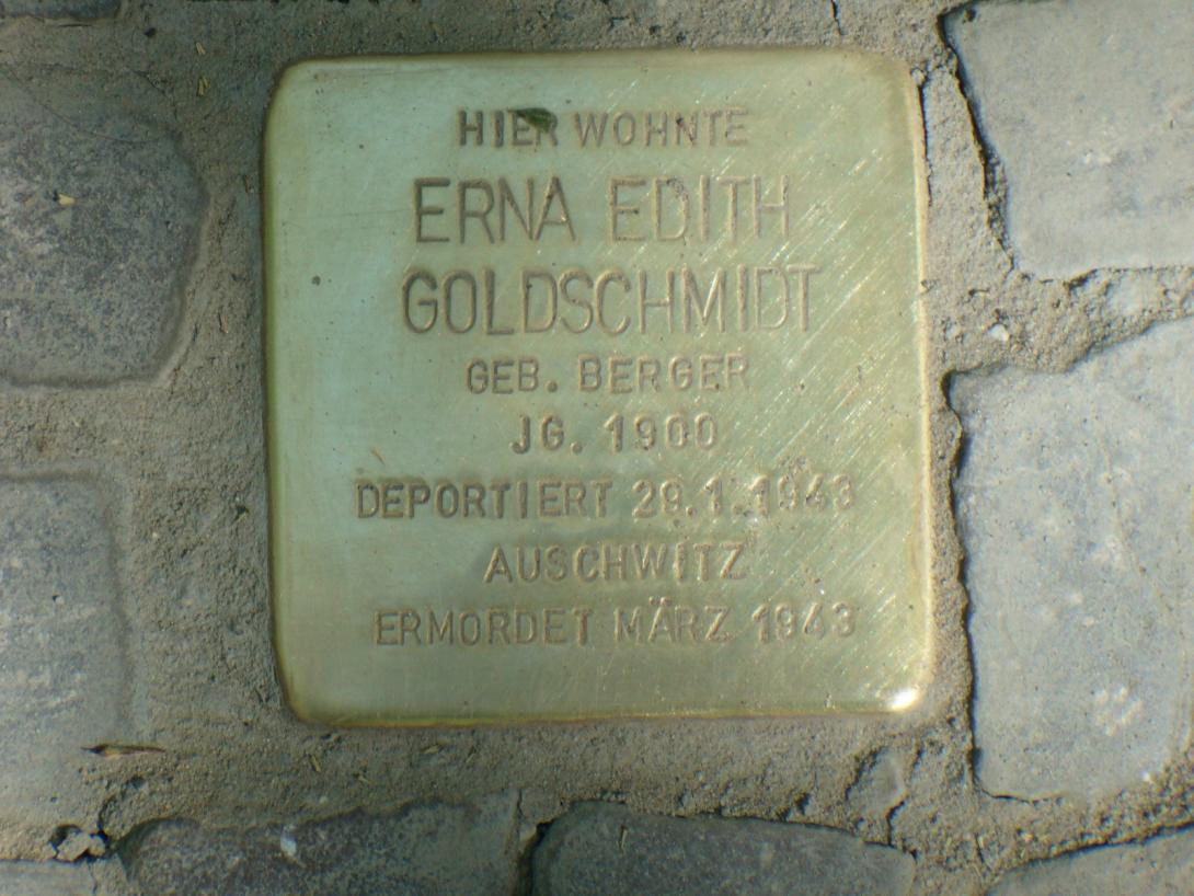 Ernas Schwiegereltern, Philipp Goldschmidt und Juliane Goldschmidt geb. Barnas hatte man schon am 21. Juli 1942 nach Theresienstadt verschleppt. Juliane Goldschmidt starb dort wenig später, am 7. August, an den Folgen der erbärmlichen Lebensumstände im Lager, ihr Mann wurde am 23. September 1942 nach Treblinka weiterdeportiert und dort ermordet. Heinz Goldschmidt ist in keinem Gedenkbuch erfasst, er überlebte vermutlich. Ernas Geschwister und ihre Tochter überlebten in Frankreich.