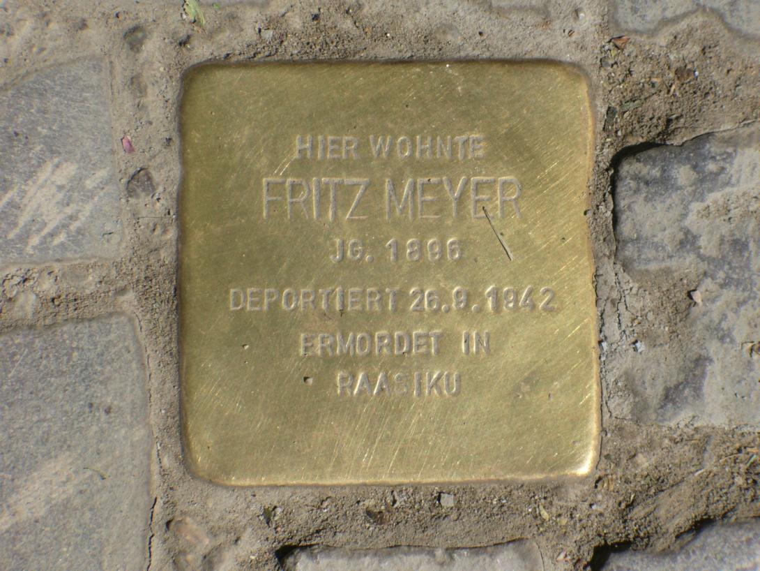Am 26. September warteten Fritz Meyer und weitere 811 Juden in Güterwaggons auf dem Verladebahnhof Moabit darauf, dass aus Frankfurt/Main kommende Wagen mit weiteren 237 Juden an ihren Zug angekoppelt wurden. Die Fahrt ging anschließend über Riga nach Raasiku in Estland und dauerte fünf Tage. Dort wurden nur wenige Menschen zur Zwangsarbeit ausgesondert (60-80 Männer und 100-150 Frauen), vornehmlich für die Ölschiefergewinnung. Alle anderen wurden mit bereitstehenden Bussen in die Dünen von Kalevi-Liiva, nördlich des Dorfes Jägala gebracht. Dort wurden sie sämtlich von estnischen Polizisten unter deutscher Leitung erschossen und die Leichen mit Sand bedeckt. 1944 mussten jüdische Sonderkommandos - die anschließend selbst erschossen wurden - die Gruben wieder öffnen und die Leichen verbrennen.