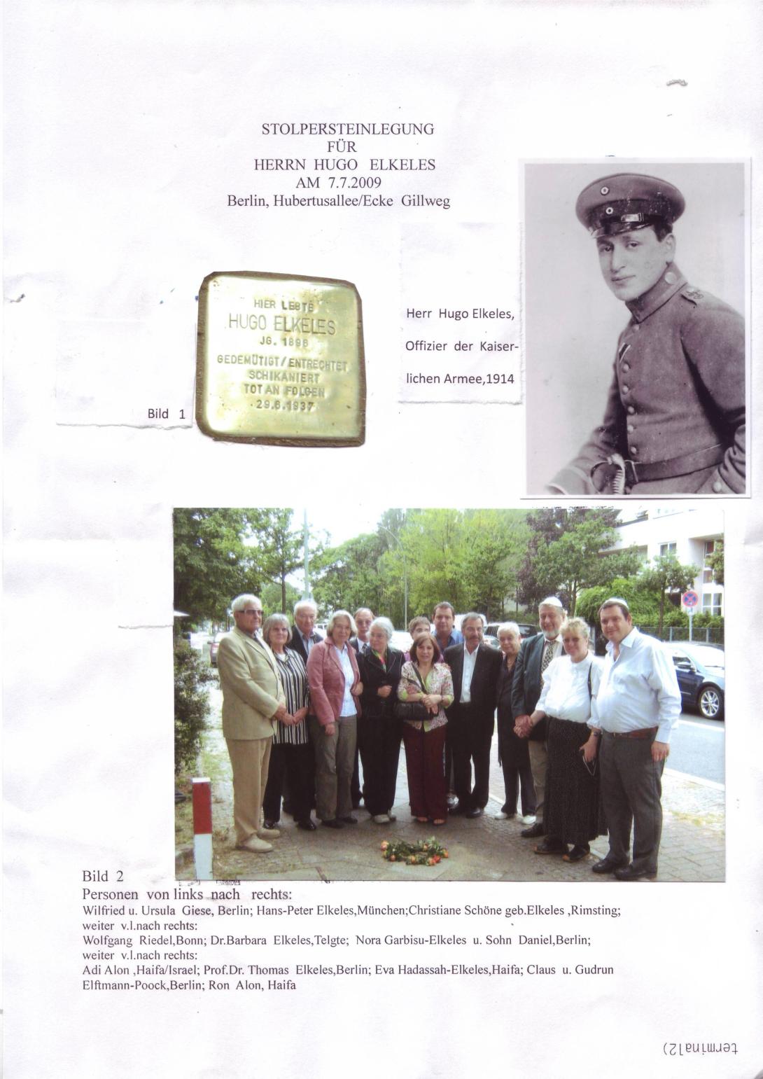 Eva Hadassah Alon Elkeles (Tochter): Mein Vater, Hugo Elkeles, wurde in Posen (Poznań) am 31. Mai 1896 geboren. Er besuchte dort das Gymnasium. Er verließ die Schule wegen zunehmendem Antisemitismus. Er trat als Lehrling in eine Holzfirma ein. Zu Beginn des Ersten Weltkrieges, 1914, meldete er sich als Einjährig-Freiwilliger und wurde im Laufe des Krieges außer mit dem Eisernen Kreuz auch mit dem Orden des Türkischen Halbmonds ausgezeichnet. Im Hauptquartier arbeitete er neben Generalfeldmarschall Paul von Hindenburg. In den Akten meines Vaters steht: Elkeles ist Jude: In Anbetracht seiner Fähigkeiten und seiner Tapferkeit vor dem Feind können wir nicht umhin, ihn zum Leutnant der Reserve zu befördern. Wir wohnten in der Gillstr. 2A im Grunewald. Im Jahre 1922 gründete mein Vater mit seinem Bruder Julian Elkeles eine eigene Firma. Die Firma Gebrüder Elkeles – Holzhandlung – hatte ihren Firmensitz in Weißensee. Schon vor 1933 stand fast täglich an der Mauer des Betriebes: „Kauft nicht bei Juden“. Im Jahre 1928 heiratete mein Vater meine Mutter Lucie Elkeles. Es war eine sehr glückliche Ehe. Mein Vater wurde ab 1933 von der