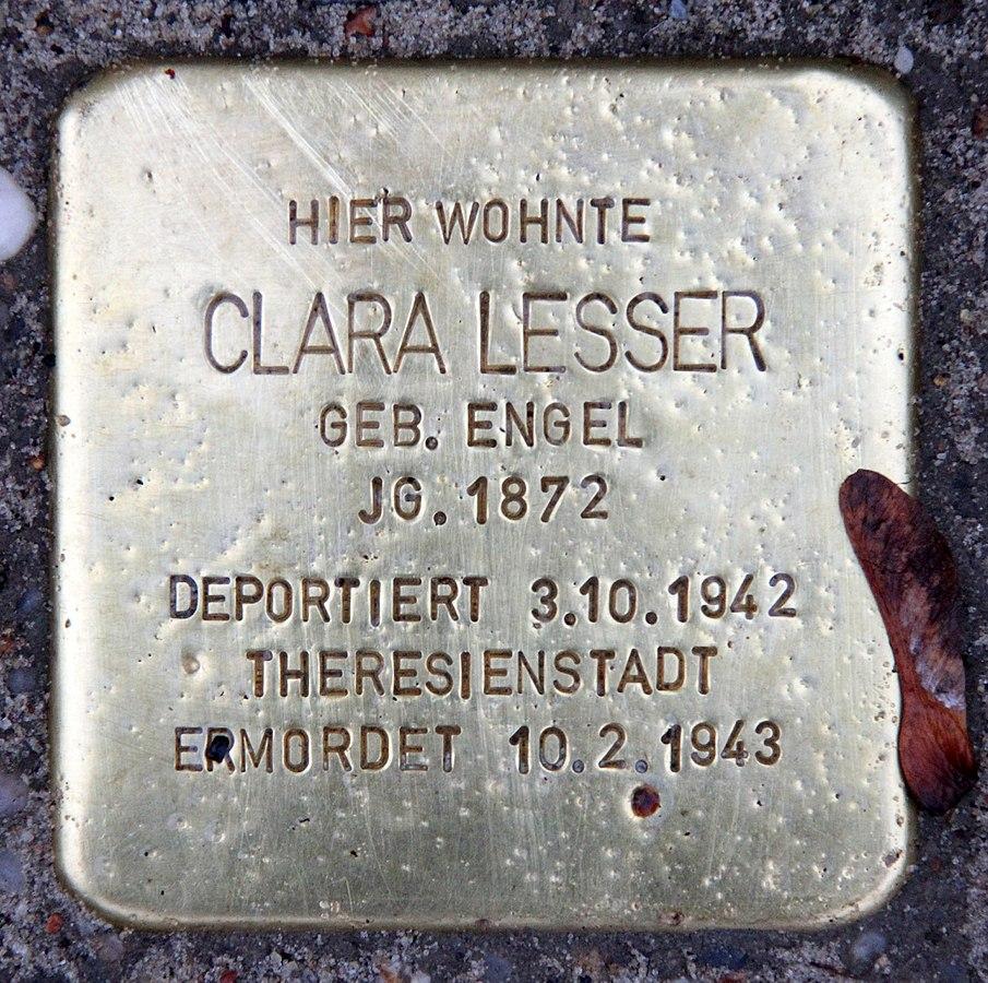 Clara Lesser wurde am 3. Oktober 1942 zusammen mit ihrer Schwester Eva und ihrem Schwager Leopold mit dem 3. großen Alterstransport nach Theresienstadt verfrachtet. In Theresienstadt trafen die beiden Schwestern ihre Kusine Fanny Brenner wieder, die am 26. Juni 1942 mit dem 11. Alterstransport dorthin deportiert worden war. Clara Lesser starb am 10. Februar 1943 um 15.30 Uhr in Zimmer 42 des Gebäudes A II. Als Todesursuche wurde "Altersschwäche – Marasmus senilis" nach vorheriger "Lungenerweiterung – Emphysema pulmonum" diagnostiziert. Ihre Schwester starb bereits am 22. Oktober 1942, ihr Schwager am 15. August 1944. Ihre Kusine überlebte sie um knapp ein Jahr. Sie starb am 13. Januar 1944.