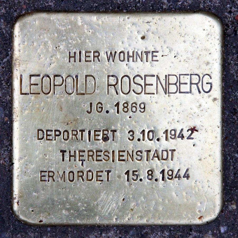 Leopold Rosenberg kam am 26. Juli 1869 in Berlin zur Welt. Wir kennen nicht die Namen seiner Eltern, noch wissen wir etwas über seine Kindheit und Jugend. Leopold Rosenberg erlernte den Beruf des Tapezierers und Dekorateurs. Er war seit Beginn des 20. Jahrhunderts mit Eva Engel verheiratet. Am 6. Juli 1901 kam der einzige Sohn Fritz zur Welt. Die Familie wohnte zunächst in der Templinerstraße 4, dann in der Regensburger Straße 3, ab 1910 in der Gleditschstraße 22 und ab 1935 in der Grunewaldstraße 12 in einer Fünfzimmer-Wohnung. Die Größe der Wohnung lässt darauf schließen, dass es der Familie finanziell gut ging und Leopold Rosenberg als selbstständiger Tapezierer und Dekorateur genügend Aufträge erhielt. Ab ca. 1936 wohnte seine verwitwete Schwägerin Clara Lesser (s. dort) mit ihnen in einem gemeinsamen Haushalt in der Grunewaldstraße 12. Am 28. September 1942 füllte Leopold Rosenberg seine Vermögenserklärung aus. Laut seiner Vermögenserklärung besaß er nur noch das in der Wohnung sich befindliche Inventar. Am 30. September 1942 wurde ihm in der Gerlachstraße 19-22 die Verfügung über den Verfall seines gesamten Vermögens zugestellt. Es ist möglich, dass sich die Rosenbergs und Clara Lesser erst kurz vor ihrer