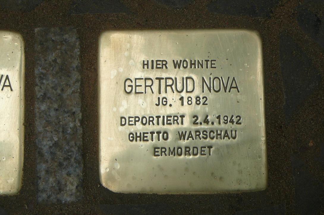 Gertrud Nova, geboren am 10. August 1882 in Posen (heute: Poznań / Polen) war die Tochter von Louis und Clara Nova und die jüngere Schwester des Architekten und Hausverwalters Max Noa Nova, geboren am 16. Mai 1881 ebenfalls in Posen. Die in Israel und USA lebenden Enkel von Max Nova wissen über Gertrud Nova und über das Leben der unverheirateten Frau so gut wie nichts. Von der Familie wurde sie liebevoll „Trude“ genannt. Gertrud Nova musste in das Sammellager in der Synagoge Levetzowstraße 7-8 und wurde am 2. April 1942 ins