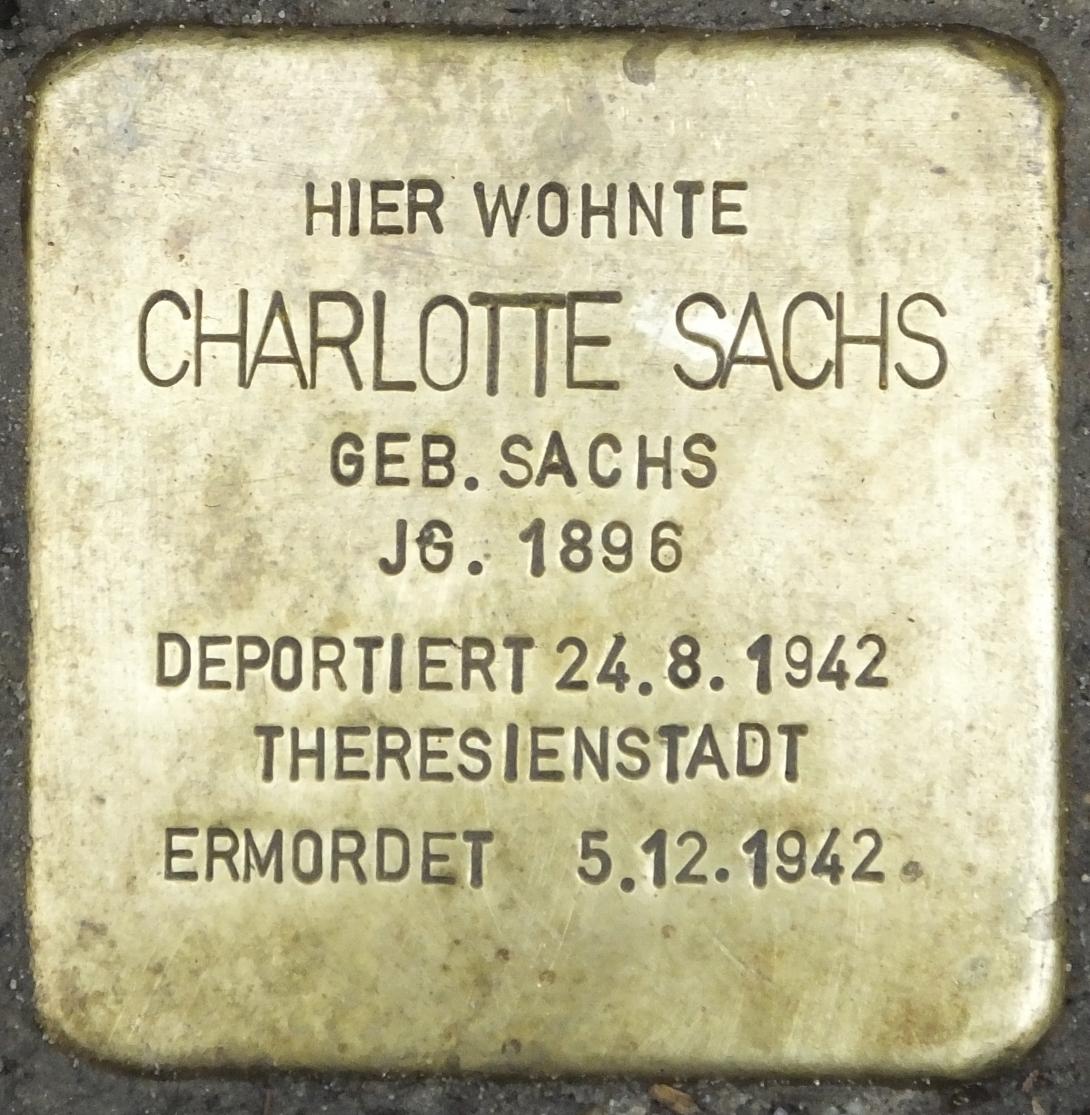 Charlotte Sachs wurde am 17. Mai 1896 in Breslau geboren, sie war Lehrerin und geschieden. In ihrer Ehe hieß sie Joel, nahm dann wieder ihren Geburtsnamen an. Zum Stichtag der Volkszählung am 17. Mai 1939 wohnte sie in der Barbarossastraße 12, danach wurde sie in der Helmstedter Straße 12 registriert.