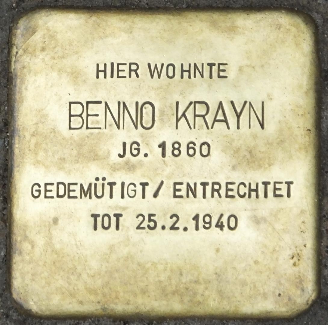 Max Benno Krayn wurde am 2. Dezember 1860 in Pudewitz (Polen) geboren; er starb am 25. Februar 1940 und liegt auf dem Jüdischen Friedhof in Berlin (Feld P, 7.Reihe, 8) begraben. Der Stein ist umgestürzt und nicht mehr lesbar. Als Bewohner der Helmstedter Straße 19 erscheint er seit 1922 im Berliner Adressbuch.