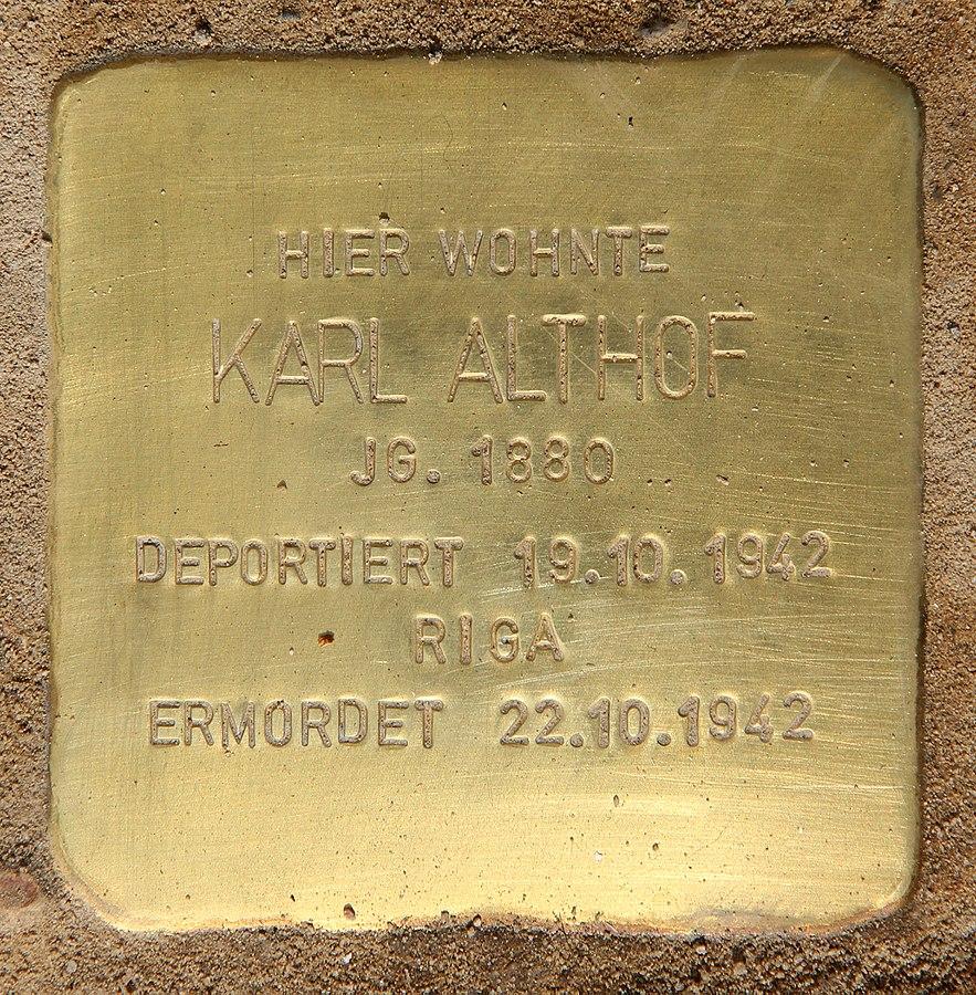 Der 62-jährige Karl Althof wird am 22. Oktober 1942 wie auch seine Ehefrau ermordet worden sein. Sein Sohn könnte zu den Zwangsarbeitern gehört haben, aber auch er kehrte nicht zurück.