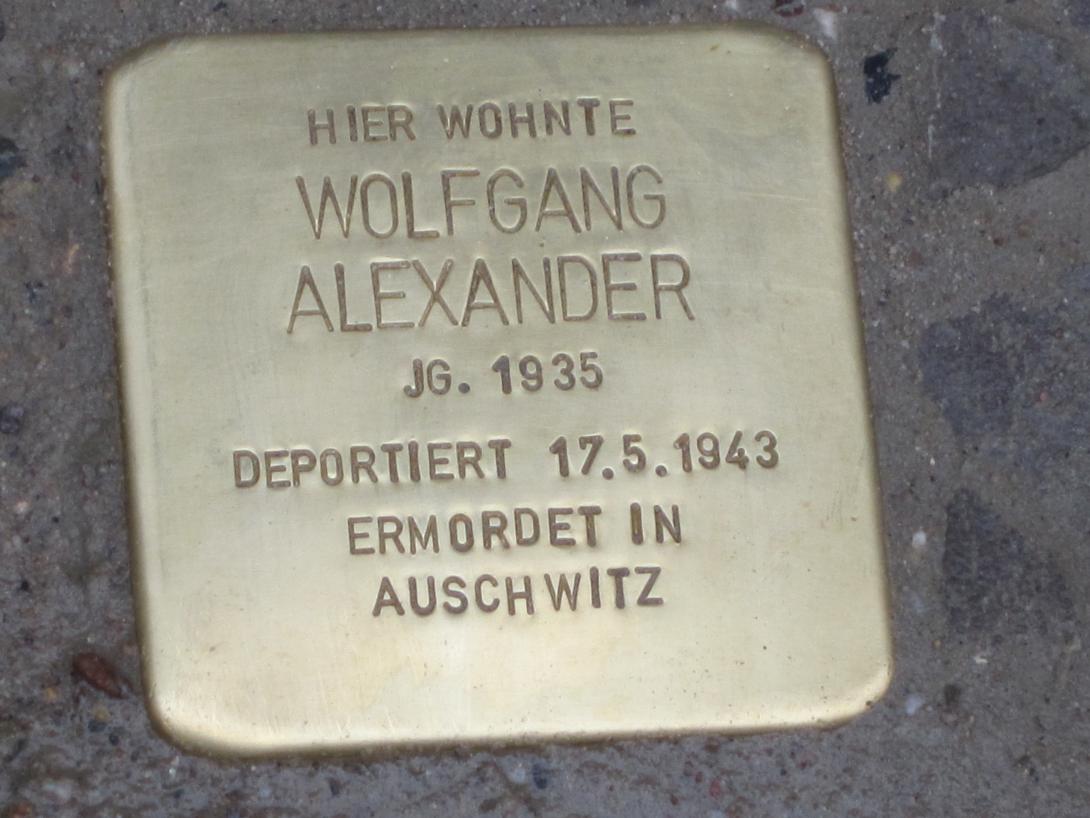Wolfgang Alexander kam am 5. Juli 1935 in Berlin als Sohn des Kaufmanns Siegfried und Hedda Alexander, geborene Rosenbaum, zur Welt. Als er knapp drei Jahre alt war, ließen sich seine Eltern scheiden. Der Vater war herzkrank und vermutlich seit 1933 arbeitslos. Die Scheidung wurde am 18. Mai 1938 wirksam. Unmittelbar darauf emigrierte seine Mutter in die USA und ließ ihren Sohn bei seinem Vater zurück. Wolfgang Alexander lebte aber vermutlich für kurze Zeit noch bei seiner Mutter in der Schönhauser Straße 164, bevor diese Ende 1938 Deutschland verließ. Am 26. Juni 1942 wurde sein Vater abgeholt und mit dem 16. Osttransport nach Minsk verfrachtet. Seinen Sohn hatte er noch rechtzeitig bei seinem Bruder, dem Arzt Dr. Leo (* 16.10.1899 in Schroda) und dessen Frau Edith Alexander (* 21.10.1907 in Dramburg), unterbringen können, die in Pankow im Retzbacher Weg 83 und schließlich im Wedding in der Badstraße 37 a wohnten.