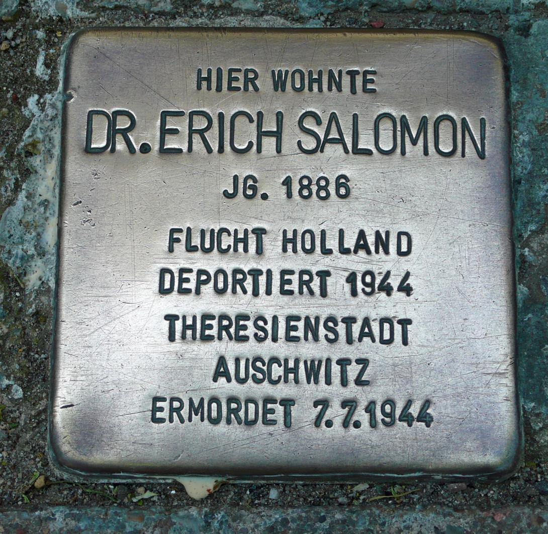 Deportiert wurde Erich Salomon aus dem Internierungslager Westerbork am 18. Januar 1944 nach Theresienstadt. In diesem Ghetto wurde er eingesperrt und am 16. Mai 1944 in das Konzentrationslager Auschwitz gebracht. Dort ist er ermordet worden, sein Todesdatum ist am 7. Juli 1944 verzeichnet.