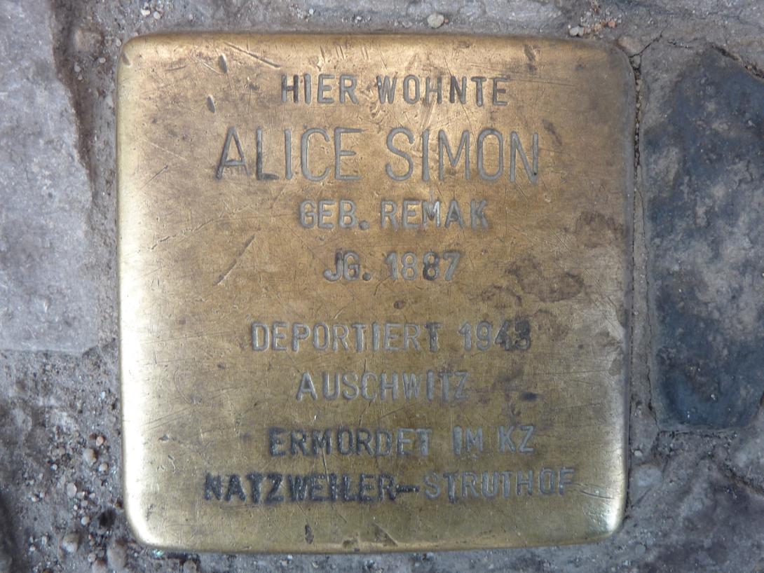 Die Charlottenburgerin Alice Simon, geborene Remak, war unter den 86 jüdischen KZ-Häftlingen, die der Anatom Prof. August Hirt (1898–1945) in Auschwitz selektieren ließ, um in seinem Institut an der Reichsuniversität Straßburg eine Skelettsammlung „Fremdrassiger“ aufzubauen. Sie lebte bis zu ihrer Deportation in der Joachimstaler Straße 12. Wie ihr Ehemann, der Rechtsanwalt Dr. Herbert Simon, war sie jüdischer Herkunft und evangelisch getauft. Herbert Simon starb 1936; ihren Sohn und ihre Tochter schickte die Witwe nach Großbritannien. Sie selber blieb bei der blinden Schwiegermutter, die 1941 starb. Am 17. Mai 1943 wurde Alice Simon nach Auschwitz und von dort aus ins KZ Natzweiler-Struthof deportiert. Dort tötete man sie wie die übrigen Selektierten im August 1943 mit Blausäure.