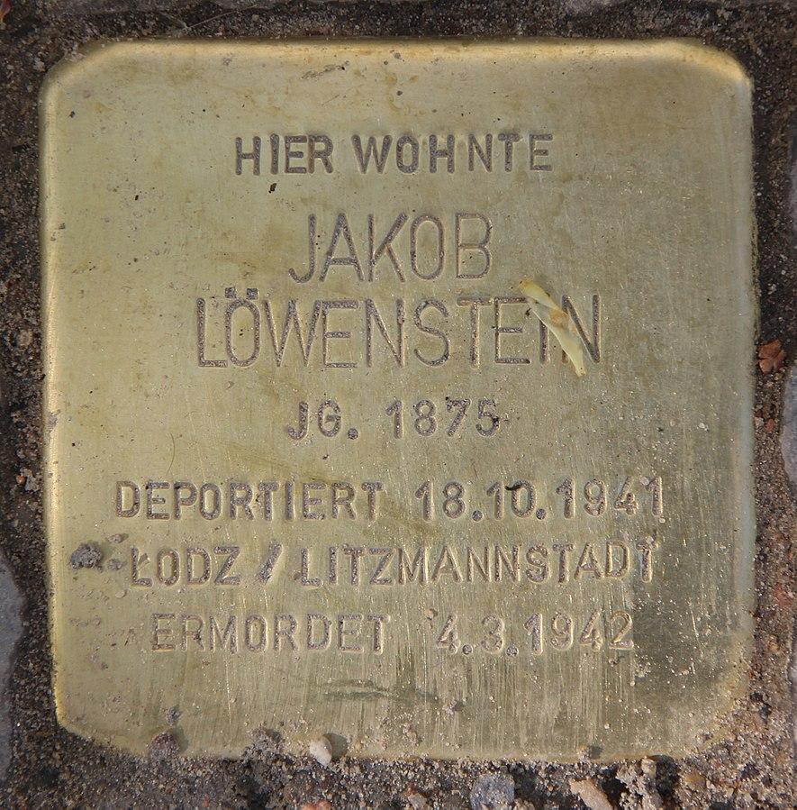 Mit dem allerersten Deportationszug, der Berlin verließ, wurde Jakob Löwenstein am 18. Oktober 1941 vom Gleis 17 des Bahnhofs Grunewald nach Litzmannstadt (Lodz) deportiert. Im dortigen Ghetto ist er am 4. März 1942 umgebracht worden.