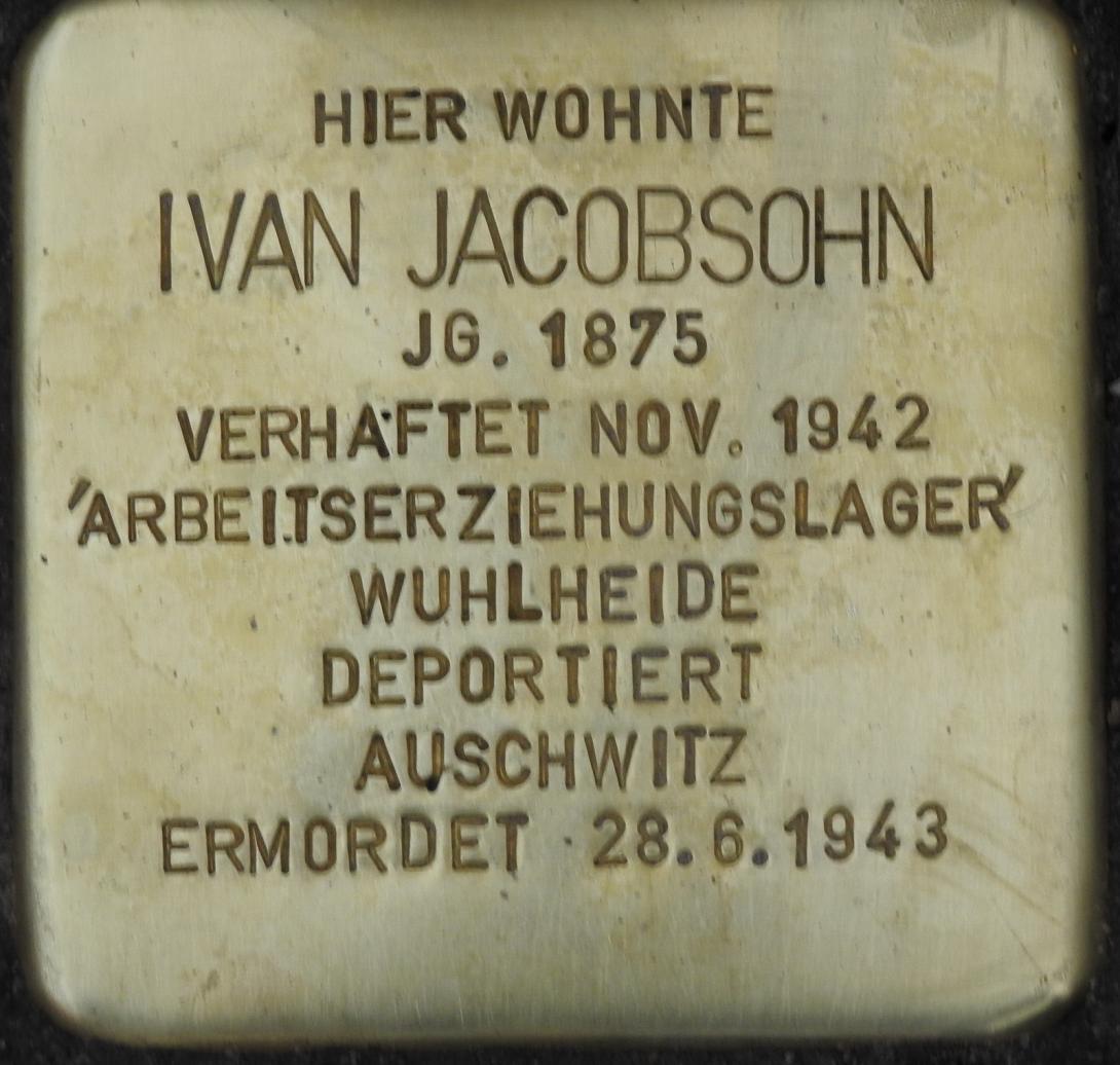 Ivan Jacobsohn wird Mitte November 1942 um 7 Uhr morgens aus der Wohnung in der Johann-Georg-Str. 24 abgeholt. Er wird zuerst nach Tegel transportiert, danach nach Mühlheim und schließlich nach Ausschwitz. Durch eine Aufseherin erfährt sie vom Tod ihres Mannes. Diese teilt ihr mit, die Polizei habe sie informiert, dass Ivan Jacobsohn am 26. Juni 1943 in Ausschwitz verstorben ist.