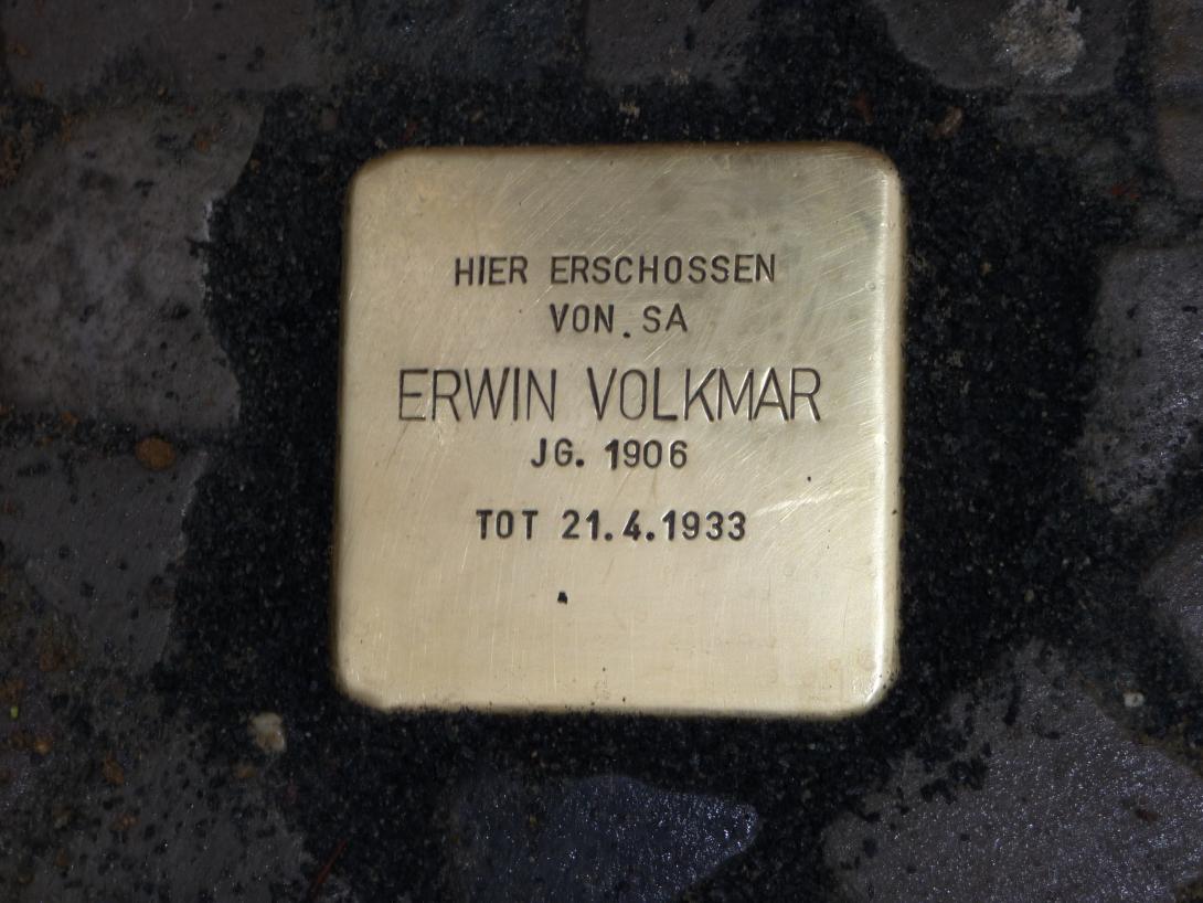 Erwin Volkmar war ein Neuköllner Boxer. Nach einer vielversprechenden Karriere als Jugendlicher und Amateurboxer wechselte er ins Profilager, wo er nur wenig erfolgreich war. Erwin Volkmar war ein Gegner der Nationalsozialisten. Am 20. April 1933 traf der berüchtigte SA-Gruppenführer und Schläger Willi Schmidt, allgemein nur „Schweinebacke“ genannt, auf Volkmar. Der SA-Mann warf Volkmar vor, Schuld zu sein an einer Gefängnisstrafe, die Schmidt 1932 für eine Schlägerei mit politischen Gegnern bekommen hatte. Wieder kam es zu einer gewaltsamen Auseinandersetzung, bei der Schmidt mindestens fünf Mal schoss. Volkmar wurde getroffen und starb am nächsten Morgen an dem erlittenen Bauchschuss. Die Ermittlungen der Polizei und Staatsanwaltschaft ergaben, dass keine Notwehr, sondern eine Tötung aus politischen Gründen vorlag. Da dies im April 1933 in Preußen bereits unter eine Amnestie fiel, wenn der Täter ein Nationalsozialist war, wurde Schmidt für den Mord an Volkmar nie zur Rechenschaft gezogen. Zaghafte Versuche in den 1960er Jahren, Schmidt anzuklagen, verliefen im Sande. Erwin Volkmar war ein frühes Opfer des Naziterrors in Neukölln. Der Stein ist an der Stelle seiner Ermordung verlegt, an der heutigen Ecke Karl-Marx-Straße / Jonasstraße.